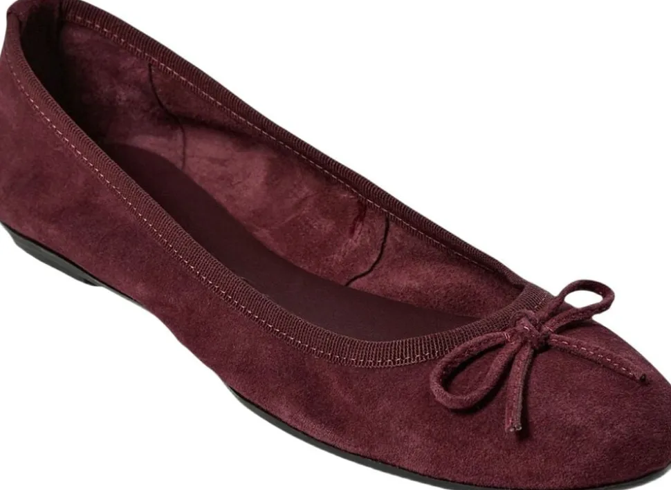 Sød ruskind ballerinasko med sløjfe over vristen. Skoen er designet i 100% læder med gummisål