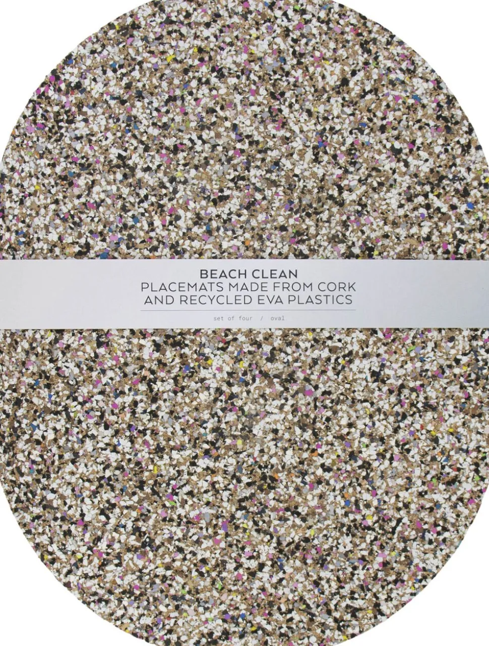 Bordbrikker fra Beach Clean-serien er lavet af en blanding af organisk kork og genanvendt EVA-plast, hvilket giver dem ikke kun et unikt udseende, men også en stærk bæredygtig profil. Sættet indeholder fire ovale bordbrikker, hver med dimensionerne 40x30x0,8 cm.