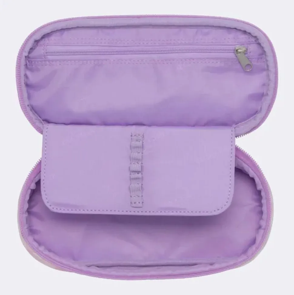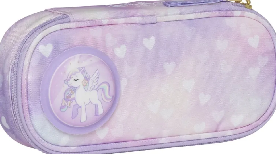 Det ovale penalhus er rummeligt og har en separat sektion til de mest brugte blyanter, og en lomme der lukkes med lynlås. Ydersiden er dekoreret med designs der matcher skoletasken, og penalhuset kommer med en aftagelig velcro button. Leveres uden indhold.