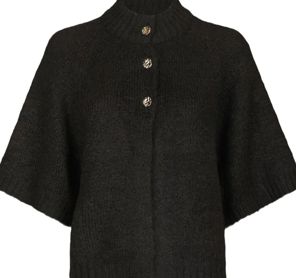 Cardigan med korte ærmer. Cardiganen har en rund halsudskæring, ærmer med vidde og en åben front med tre dekorative knapper. Den er lavet i en blød, fluffy kvalitet og har en løs pasform. Modellen er iført størrelse 36.