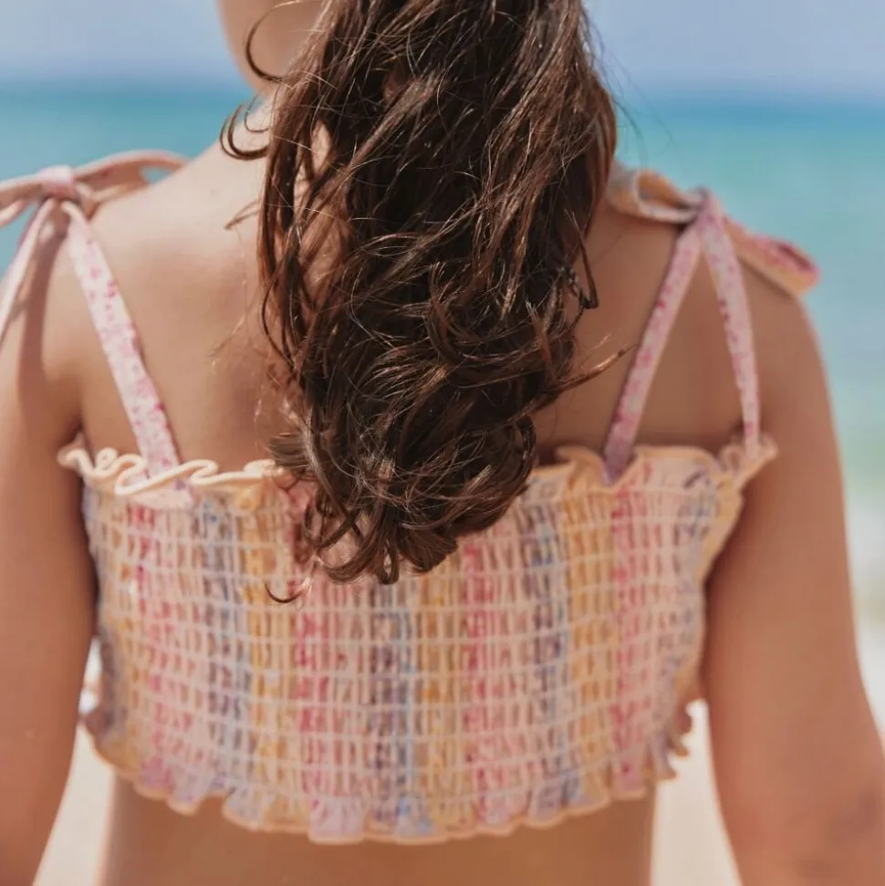 Skøn biniki med smockdetaljer til børn. – Overdel: Smockdetaljer samt tynde stropper med sløjfer – Underdel: Elastik i taljen – Håndtegnet signaturprint Denne bikini er perfekt til en varm dag på stranden, ved poolen, i haven eller blot i svømmehallen. Bikinioverdelen har tynde stropper med en fin lille sløjfe på toppen. Underdelen har elastik i taljen for god komfort. Al badetøj er overvejende produceret i genanvendt polyester, og er Standard 100 fra OEKO-TEX® certificeret. Forlæng dit badetøjs levetid: – Ved altid at skylle dit badetøj efter badning i klor- eller saltvand. – Ved at følge vaskeanvisningerne — – Standard 100 fra OEKO-TEX® – 83% Genanvendt polyester, 17% ElastanSøt bikini med print og smockdetaljer for barn. – Smockdetaljer – Wheat-signaturprint – Smale skulderstropper med små sløyfer Wheats bikini passer perfekt til en dag på stranden eller i svømmehallen. All badetøyet vårt er hovedsakelig laget av resirkulert polyester, og er behagelig for barnet å ha på og bevege seg i. Slik tar du vare på badetøyet ditt: – Skyll alltid badetøyet etter bruk i klor- eller saltvann – Følg vaskeanvisningen — – Standard 100 by OEKO-TEX® – 83% Resirkulert polyester, 17% Elastan
