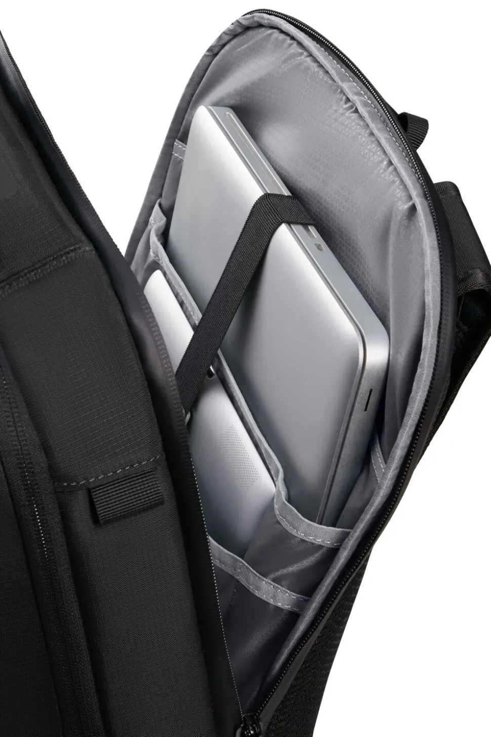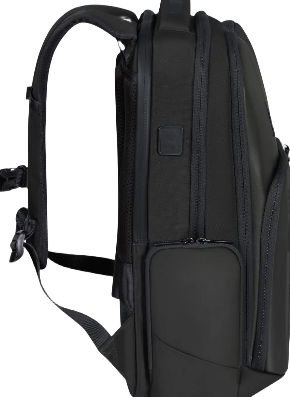 Computer rygsæk med plads til 15,6″ PC og 10,5″ tablet, både det indvendige og udvendige stof er lavet af genbrugsplast, flaskeholder i siden, frontlomme med lynlås, brystrem, ergonomiske stropper, rumindhold 22,5 l, vægt 1,2 kg. 2 års garanti.