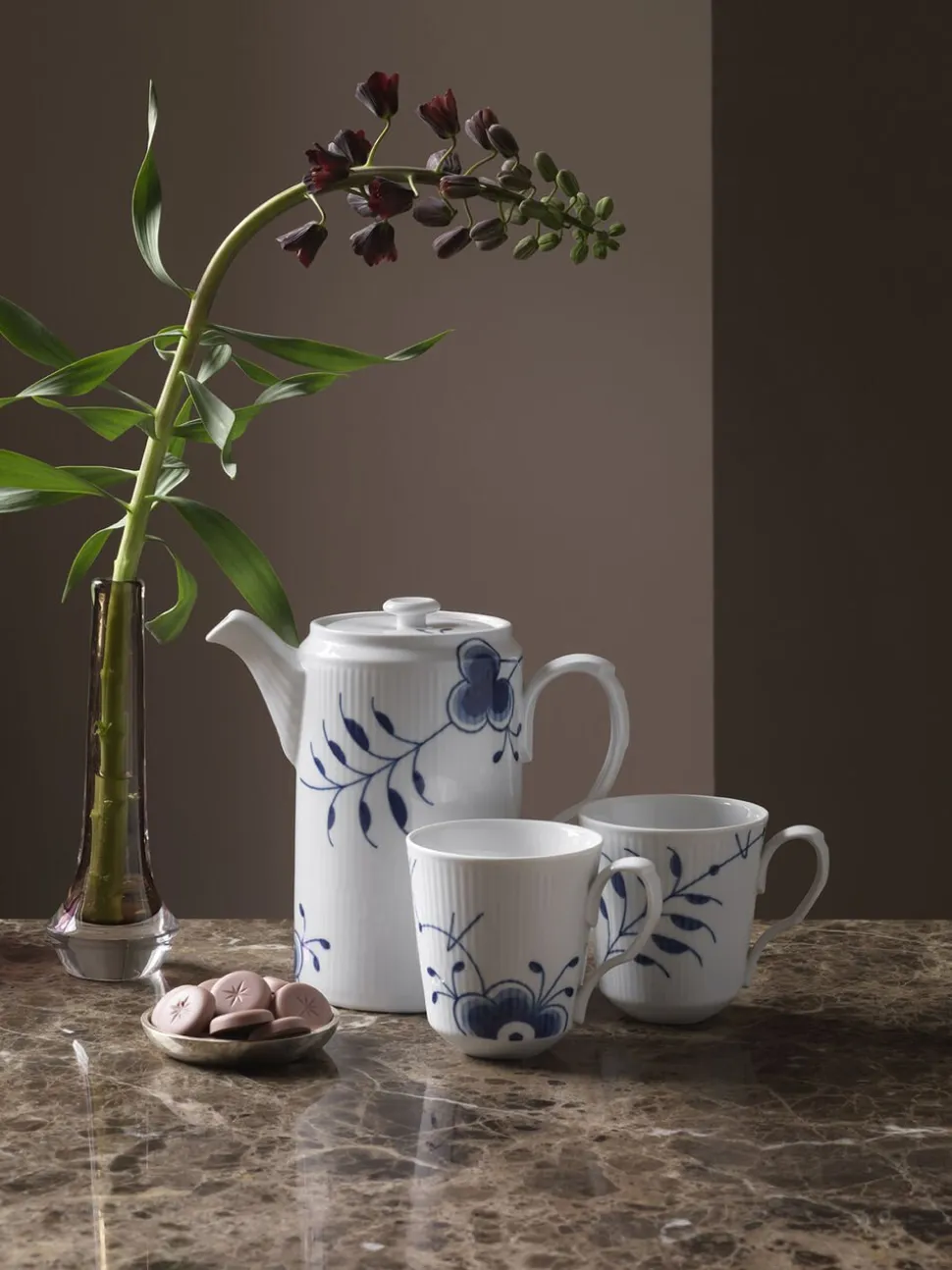 Ofte er nye tilføjelser til Royal Copenhagens stel inspireret af gamle skatte fra porcelænsfabrikkens 245-årige historie, og den nye kande med låg i Blå Mega Riflet er ingen undtagelse. På trods af cylinderformen fremstår kanden moderne i sin slankhed, men designet er faktisk inspireret af en kaffekande fra 1906.