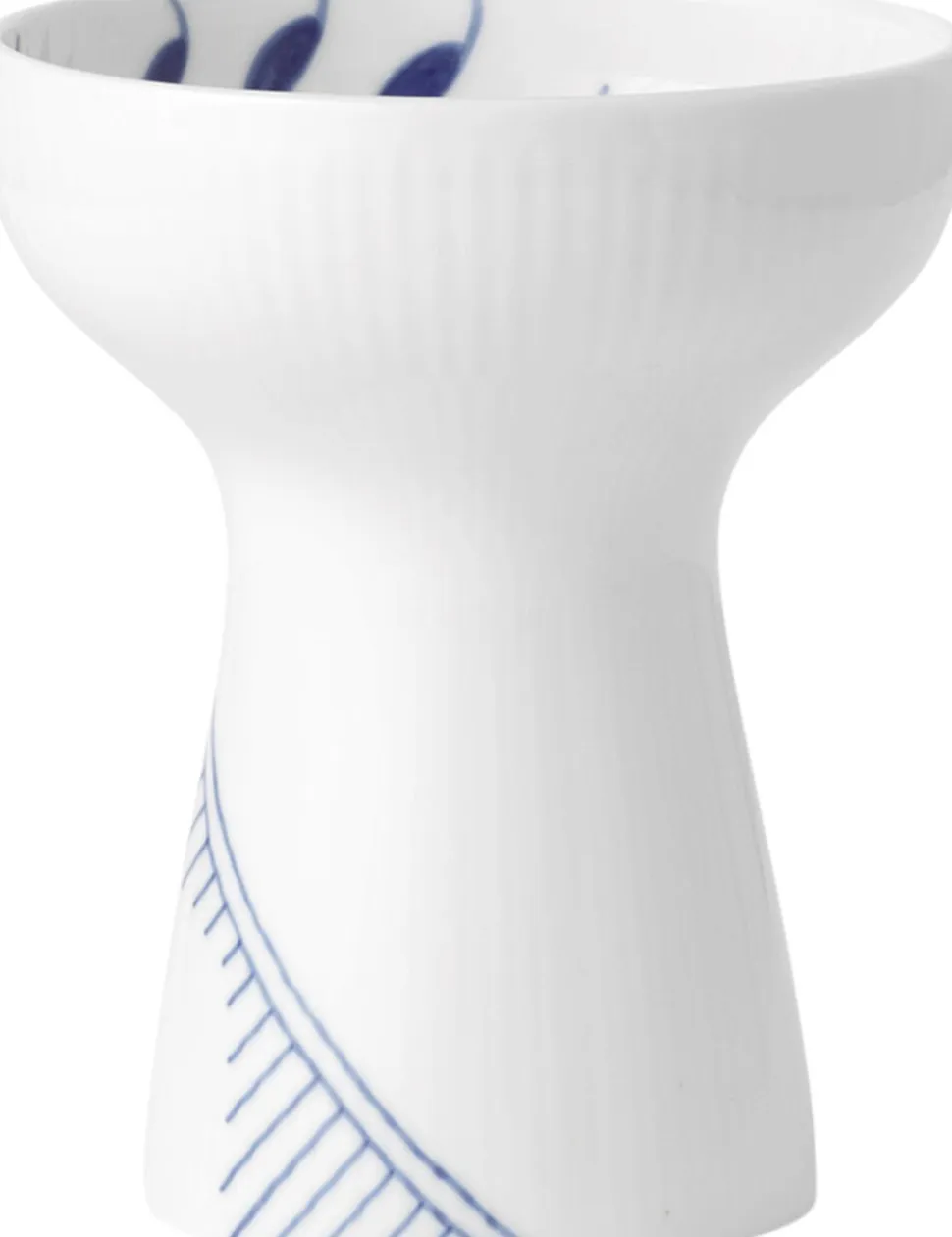 Til foråret får Blå Mega Riflet-stellet et nyt medlem i form af den smukke åbne vase i to størrelser. Med et nyt og unikt formsprog er vasen smuk til både klassiske og moderne blomsterdekorationer, og de to størrelser af vasen kan enten optræde som et smukt par eller som enkeltstående små kunstværker.
