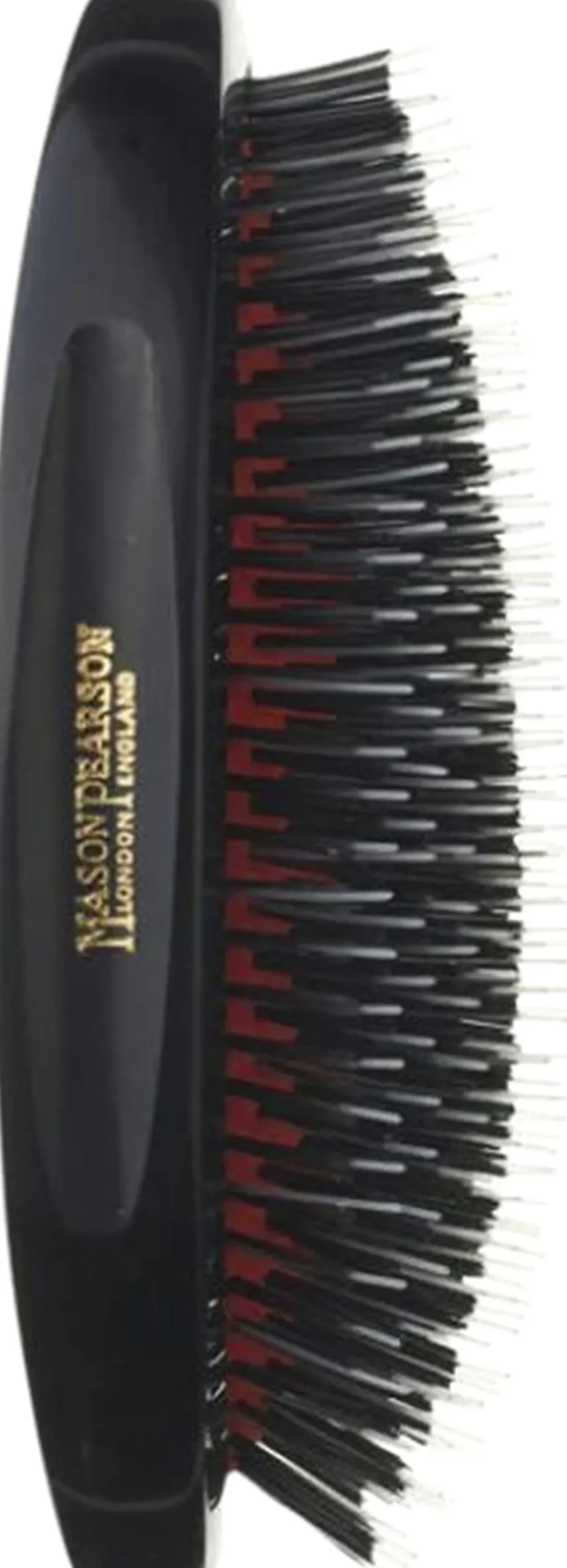 Mason Pearson BN1M er den største herre børste i sortimentet og er fremstillet af vildsvinehår og nylon. Mason Pearson børsten i vildsvinehår og nylon anbefales fra normalt til tykt hår. BN1M er specifikt designet som en herrebørste, Military style betyder at børsten ikke har et håndtag og er generelt kraftigere og mere maskulin i sit udtryk. En Mason Pearson børste masserer og stimulerer hovedbunden, hvorved hårbundens naturlige olier bliver frigivet. Ved gennembørstning bliver olien fordelt ud i længden af håret, så håret får en naturlig glans, samt fylde i bunden. Mason Pearson anbefaler 100 strøg om dagen – en investering i et godt hår hele livet!