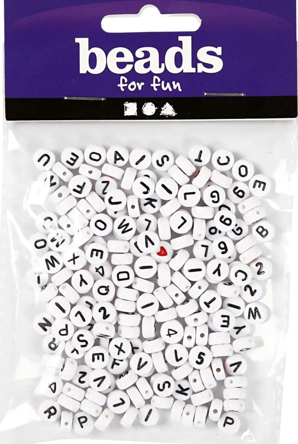 Runde perler med alfabetet (A-Z), talrækken og hjerter. Alle af hvid plast med præg og kulørt tryk på flad for- og bagside.