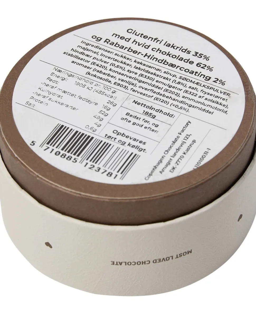 Lakridsdragé fra Magasin du Nord Chocolate med hvid chokolade og rabarber-hindbærcoating i en dekorativ æske. Lakridsen er glutenfri, produceret i Danmark og er lavet af udsøgte råvarer. Forkæl dig selv eller en du har kær med denne fine gaveæske.