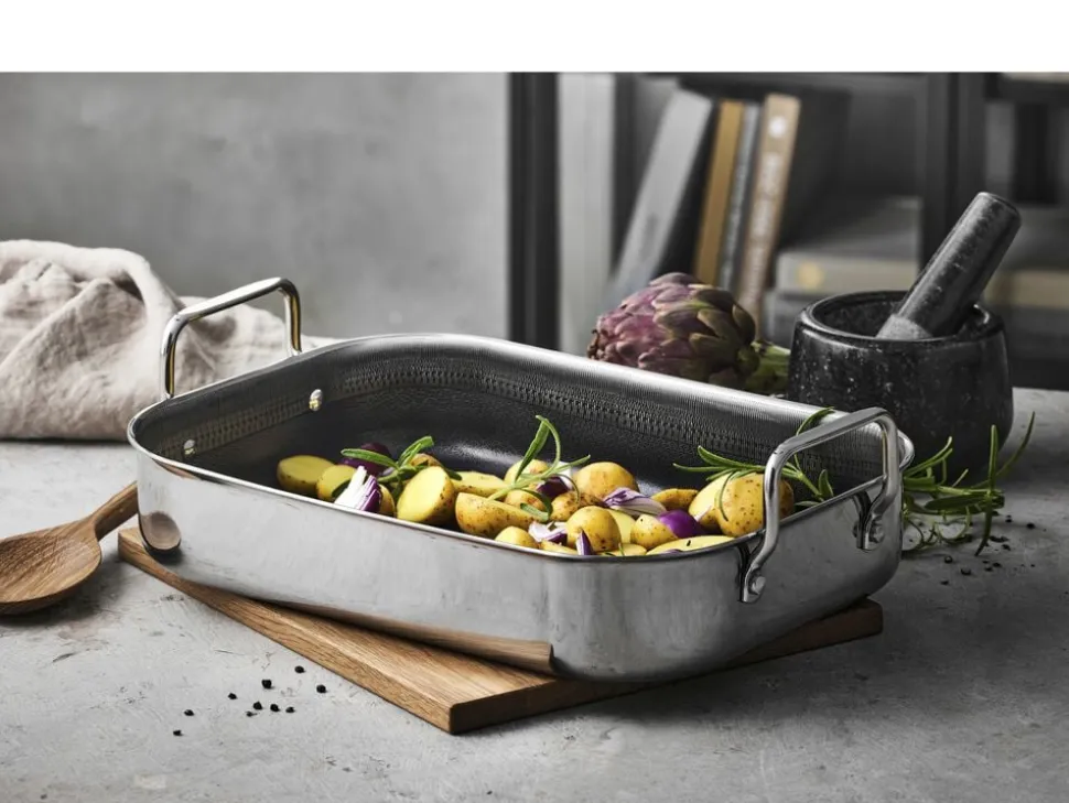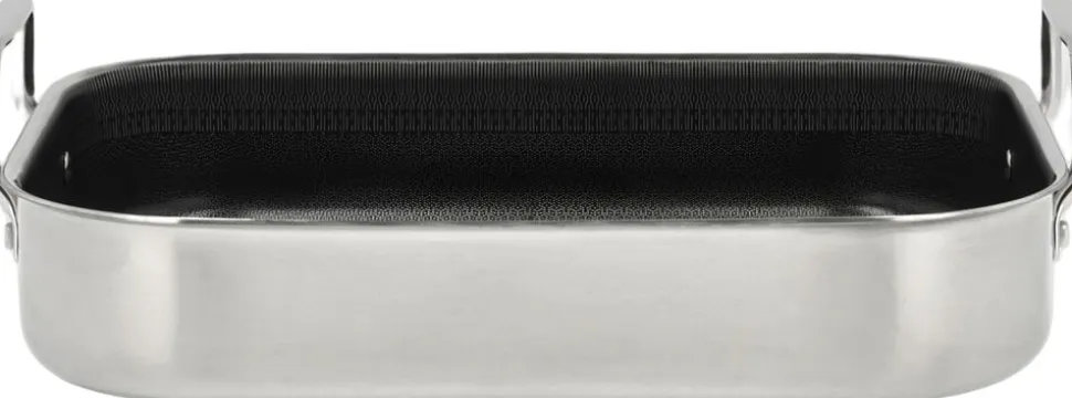 Bradepande, 39 x 26,5 x 10,6 cm. Paillon Hybrid-serien fra Pillivuyt Gourmet er fremstillet i 3-ply rustfrit stål, som er en konstruktion af to lag rustfrit stål med et aluminiumlag imellem. Det betyder, at varmen fordeles hurtigt og fastholdes jævnt. Takket være den indvendige keramiske hybridbelægning får du en slidstærk overflade med en effektiv non-stick-effekt. Det forhøjede mønster i rustfrit stål beskytter bunden, mens den keramiske topbelægning sikrer, at maden ikke brænder fast. Kort fortalt: Fremstillet i 3-ply rustfrit stål Keramisk hybridbelægning på indersiden Poleret rustfrit stål på ydersiden Velegnet til alle varmekilder også induktion Tåler alle redskaber, men vi anbefaler træ, plast eller silikone Tåler ovn op til 240 °C (gryder dog uden låg) Håndopvask anbefales Produceret uden PFAS
