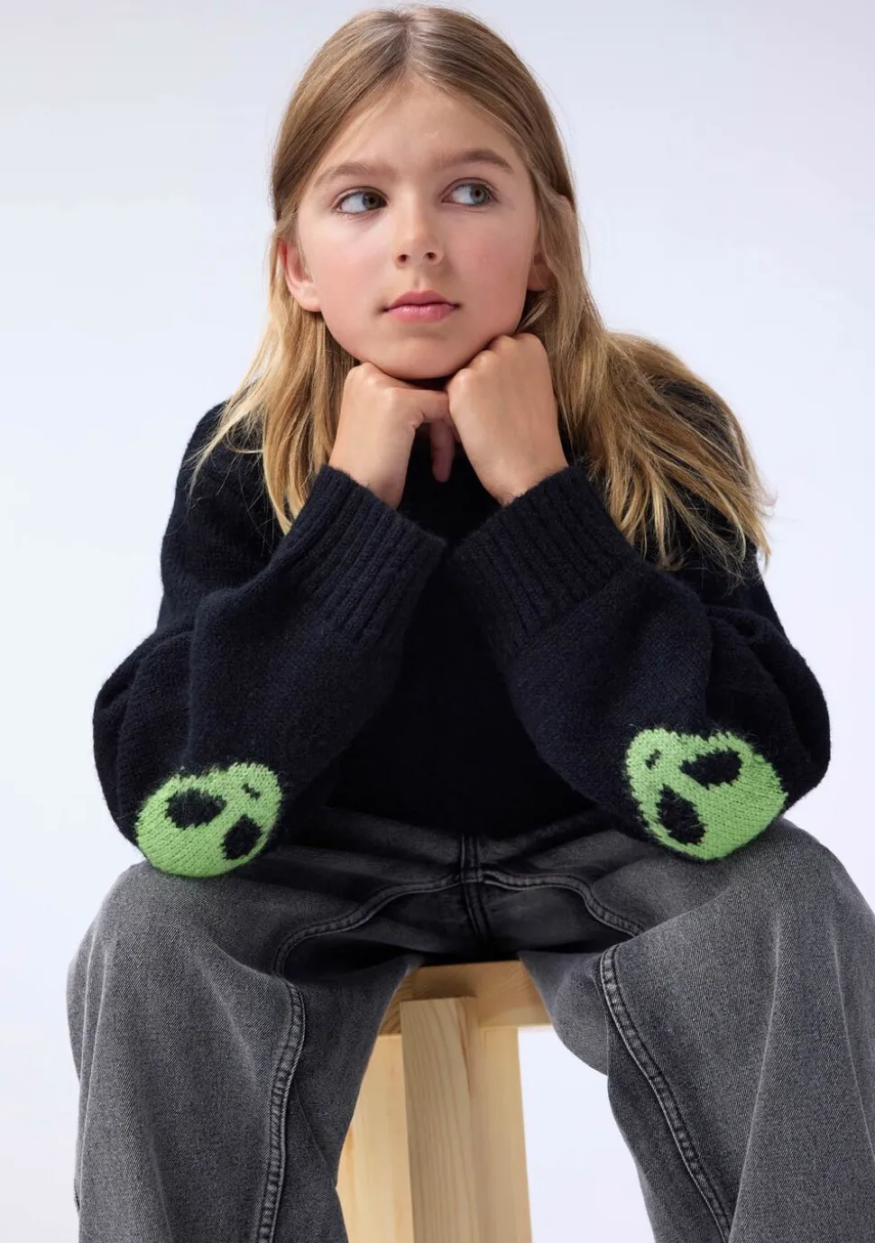 Denne sorte striktrøje fra Molo er lavet i en blød alpaka-uldblanding. Trøjen har en sjov detalje med vævede grønne alien på albuerne og ribstrik ved halsudskæringen, ærmerne og hofteområdet. Den har en almindelig pasform.