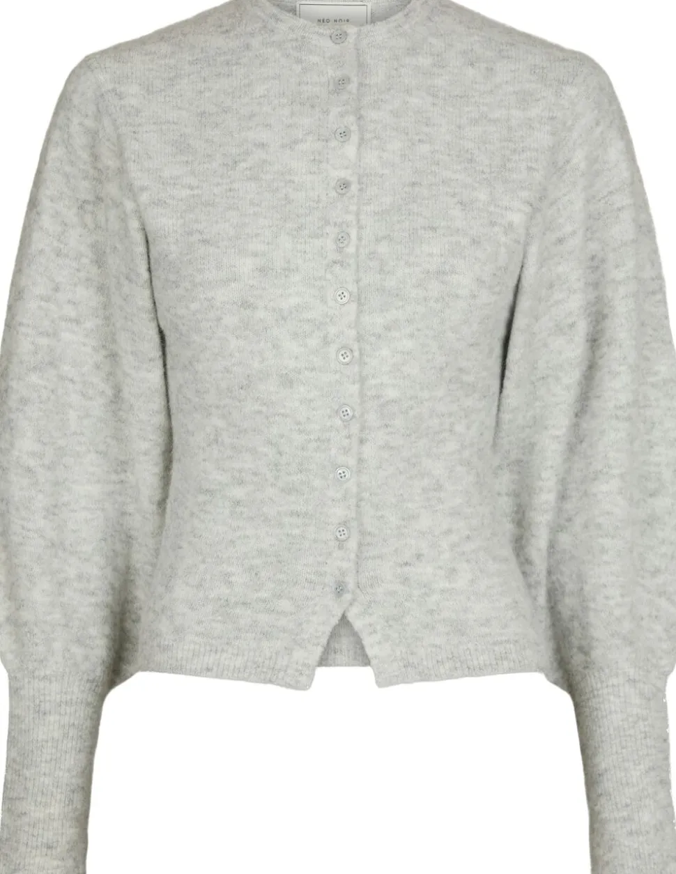 Strikket cardigan med lange ærmer. Cardiganen har en rund halsudskæring, ballonærmer med tætsiddende manchetter og lukkes med knapper langs fronten. Den har en lille slids foran. Materialet er en blød uldblanding, og den har en tætsiddende pasform. Modellen er iført størrelse 36.