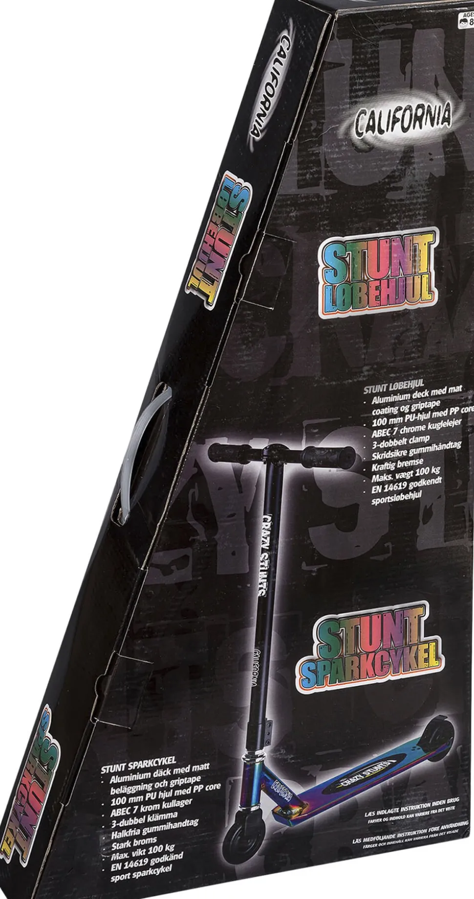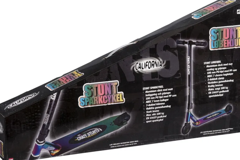 California Crazy Stunts stuntløbehjul Specifikationer: Stærk kvalitet og lækkert design Rainbow aluminiumdeck med griptape 100 mm PU-hjul med PP core ABEC 7 chrome kuglelejer 3-dobbelt clamp Svejseforstærket T-bar Skridsikre gummihåndtag Kraftig bremse Bæreevne: 100 kg EN14619 godkendt sportsløbehjul