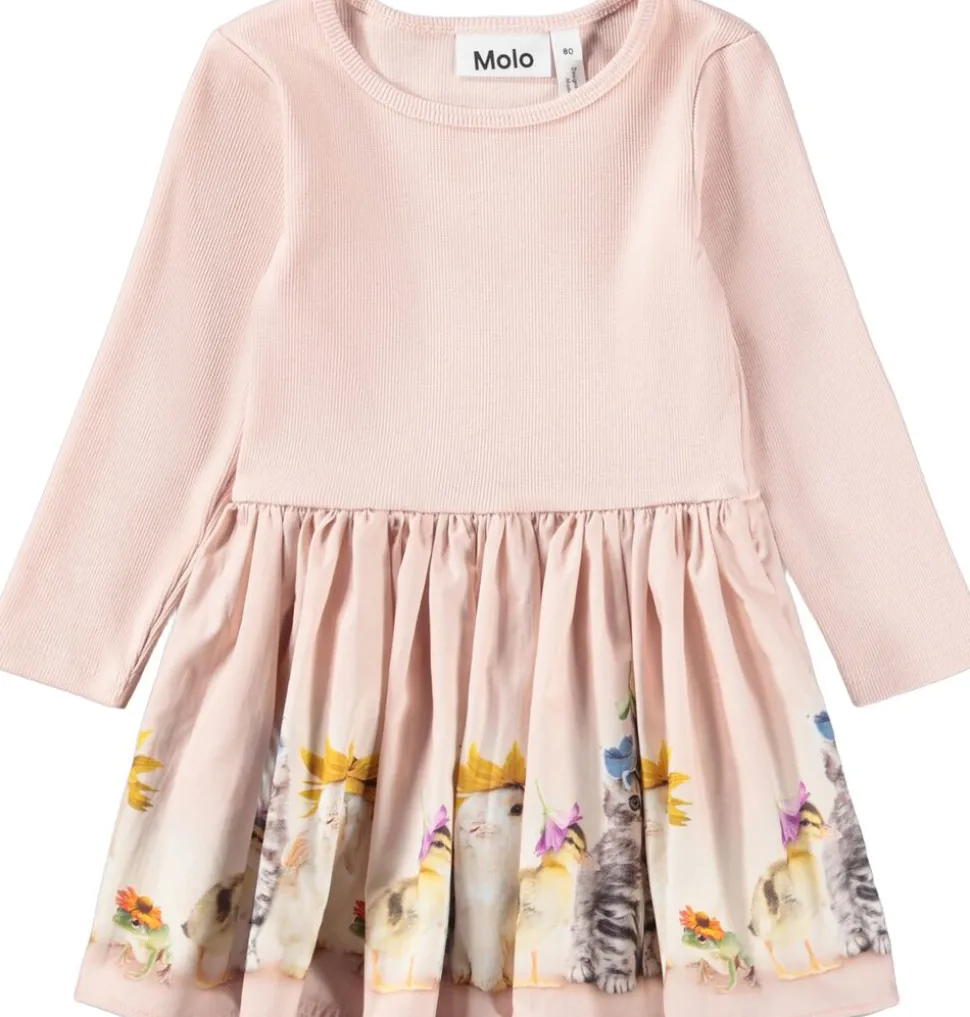 Langærmet kjole til baby med dyreprint på skørtet, fremstillet af blød ribbet jersey. Toppen sikrer en tætsiddende pasform, mens det lette poplinskørtsdesign tilføjer dejlig volumen. Denne kjole er komfortabel og perfekt til leg. Den er nem at tage af og på, hvilket gør den til en praktisk løsning for forældre, der ønsker stil og funktionalitet i hverdagen.