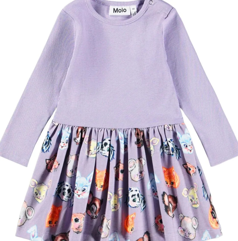 Denne kjole fra Molo er lavet i økologisk bomuldsjersey og har et print af nuttede dyr. Toppen er tætsiddende i ribbet jersey med en rund hals og knap på skulderen. Påsyet skørt med fin volumen.