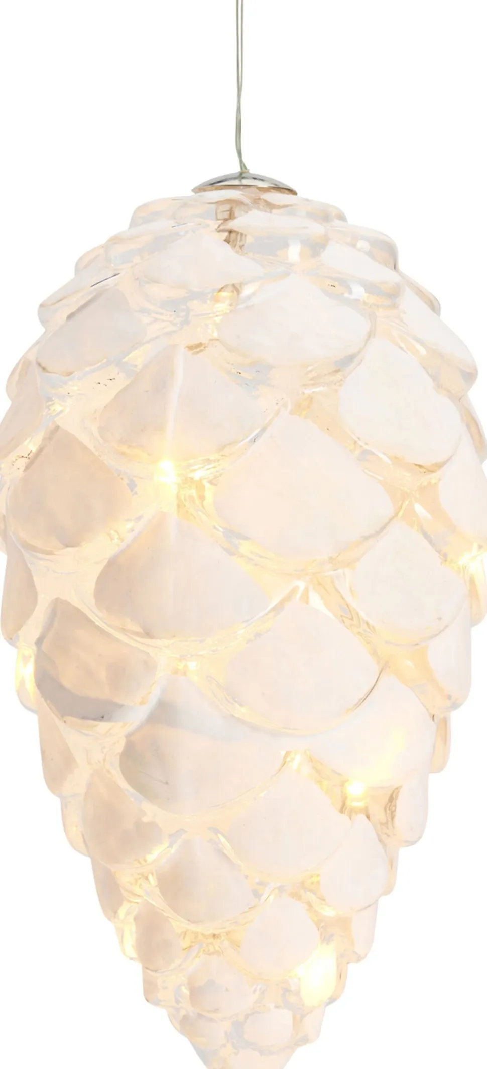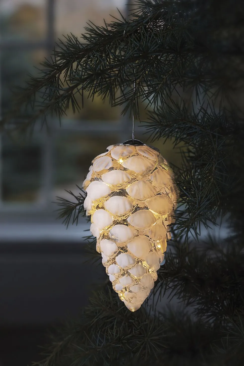 Kogle ornament i mundblæst glas med hvid dekoration på. LED lysene reflekter med et varmt lys fint i glasset.
