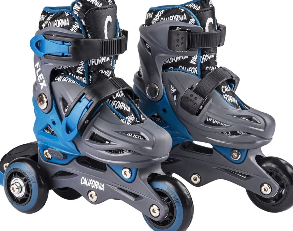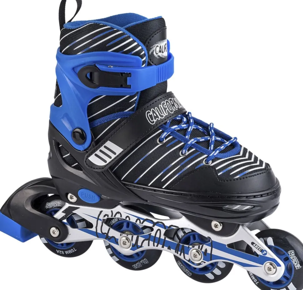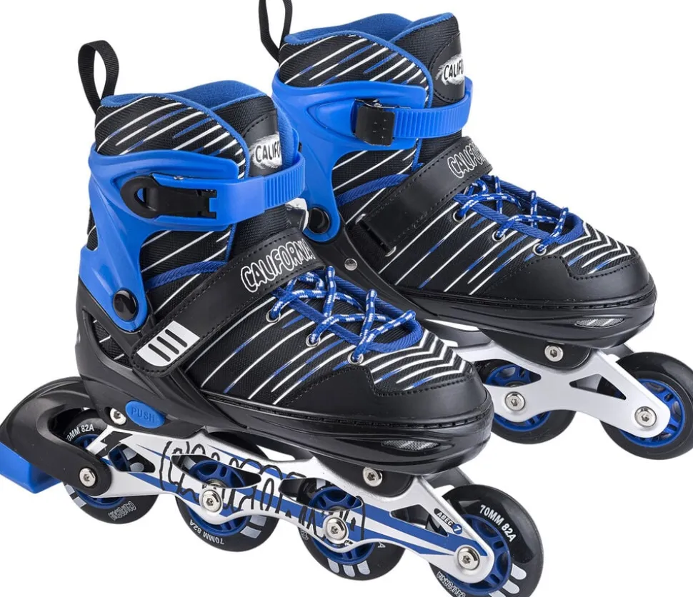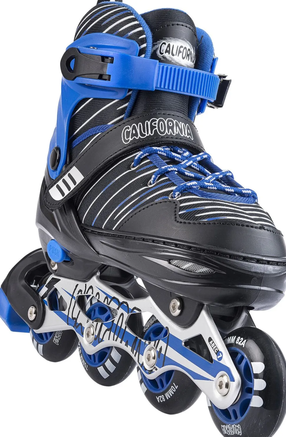 California justerbare inliners sort/blå Fleksible inliners der kan justeres i størrelserne 31-34, 35-38 eller 39-42 Specifikationer: Alu truck ABEC 7 kuglelejer 82A PU-gummihjul Snørebånd. spænde og velcrostrap Fleksibel indersok og sål Bremseklods 4 størrelser pr skøjte
