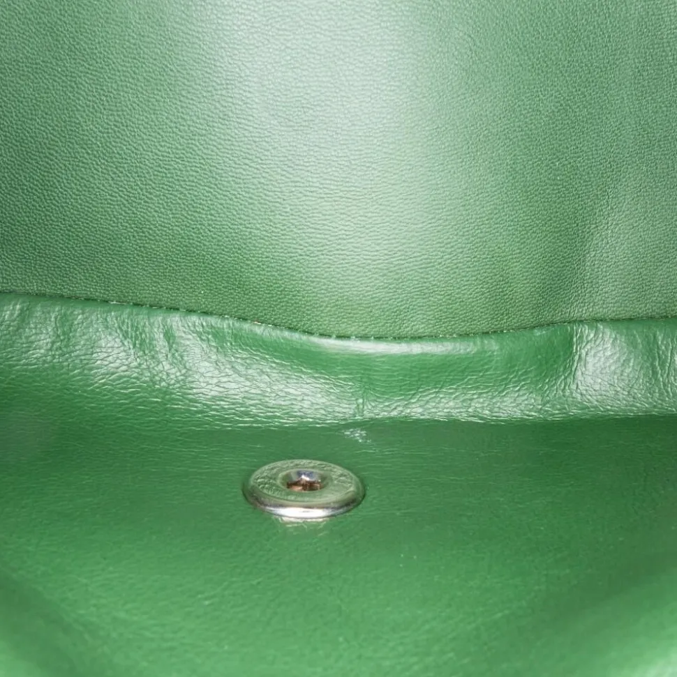 This shoulder bag features a quilted patent leather body, a leather woven chain link strap, double flaps with CC turn-lock closure, an exterior back slip pocket, and interior zip and slip pockets. Interior lining has been repainted. It carries a B+ condition rating. Exterior back cracked and creased. Exterior bottom worn. Lock scratched. Exterior corners worn. Embellishment scratched. Exterior front creased. Exterior handle worn. Interior lining repaired and worn. Practical attachment scratched. Exterior side cracked and creased. Exterior top worn. Zipper scratched.