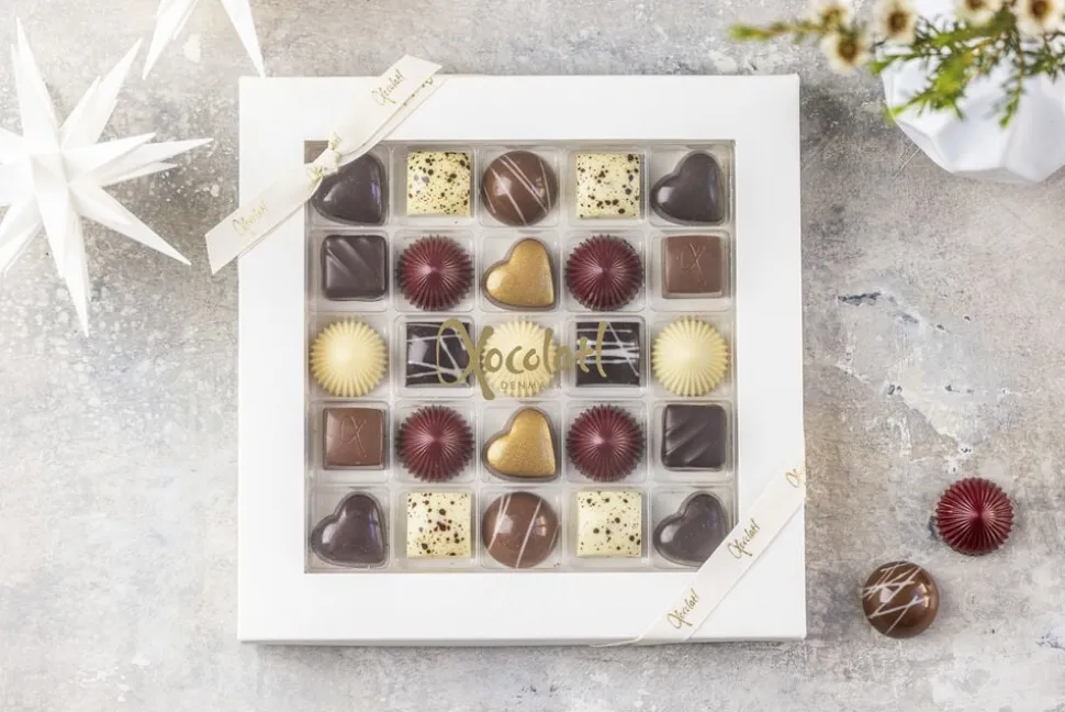 Gaveæske med 25 fyldte chokolader. Lækre smagskombinationer saltkaramel, lakrids, marcipan,