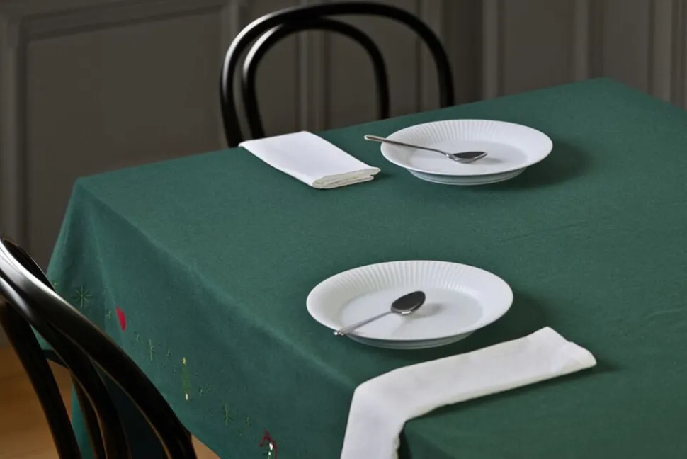 Mærk stemningen med JUNA Christmas Fable magiske juletekstiler til alle rum. Juleeventyr, fantasi og humoristiske dekorationer med masser af cosy kant. Med JUNA Christmas Fable får du en serie af moderne tekstiler med broderede motiver, der både æstetisk og legende forankrer og fornyer julens helt særlige stemning gennem et magisk juleunivers fuld af traditioner, hygge og personlighed. Tænk på en komplet og fuldstændig gennemført julekollektion af certificerede tekstiler til både dit køkken og resten af hjemmet. De dekorative julesokker på trappen fyldt op med dagens kalendergaver. Duftene fra køkkenet, der blander sig med hjertevarme forventninger og kærlige minder om en hyggelig aften i stuen. Den ikoniske juleborddækning, der løfter stemningen og får både børn og voksne til at glædes sammen. Og forestil dig så det hele tilsat nærmest karikerede klassiske broderier, der fortæller endnu flere historier end de tråde, de er syet med. Tryllebunden misteltensmagi, skitseagtige juletræer, nuttede rensdyr, ikoniske julehjerter og fluffy julestjerner. Alle skabt med masser af glimt i øjet i en sød og bevidst naivistisk stil, der ikke kan undgå at sende dit julehumør helt op til den skønneste stjernehimmel. JUNA Christmas Fable er skabt til at samle os omkring bordet, i køkkenet og også trække julestemningen med helt ind på puden, inden vi rammer drømmeland. Fuld af små broderede detaljer. Spækket med de helt store julefølelser. Denne fortryllende JUNA Christmas Fable-dug i en dyb julegrøn farve er dekoreret med et fantastisk mix af broderede julemotiver ned langs siderne af dugen, så du ikke skjuler de søde dekorationer, når du dækker op med skåle og fade og alle dine andre julefavoritter på midten af bordet. Dugen måler 150×270 cm og kommer i et skønt mix af GRS-certificeret genanvendt bomuld, GRS-certificeret genanvendt polyester og en lille smule viskose, der gør stoffet ekstra lækkert. JUNA Christmas Fable-serien giver dig et bredt udvalg af certificerede juletekstiler til hele hjemmet, hvor du mærker julestemningen i hver eneste tråd, og som du kan glæde dig til at finde frem jul efter jul. En kærlighedserklæring til godt håndværk og dekorativt dansk design vævet sammen af store eventyr og små broderede detaljer skabt til at holde længe og blive elsket endnu længere. (GRS Certified by Control Union, 1026087)