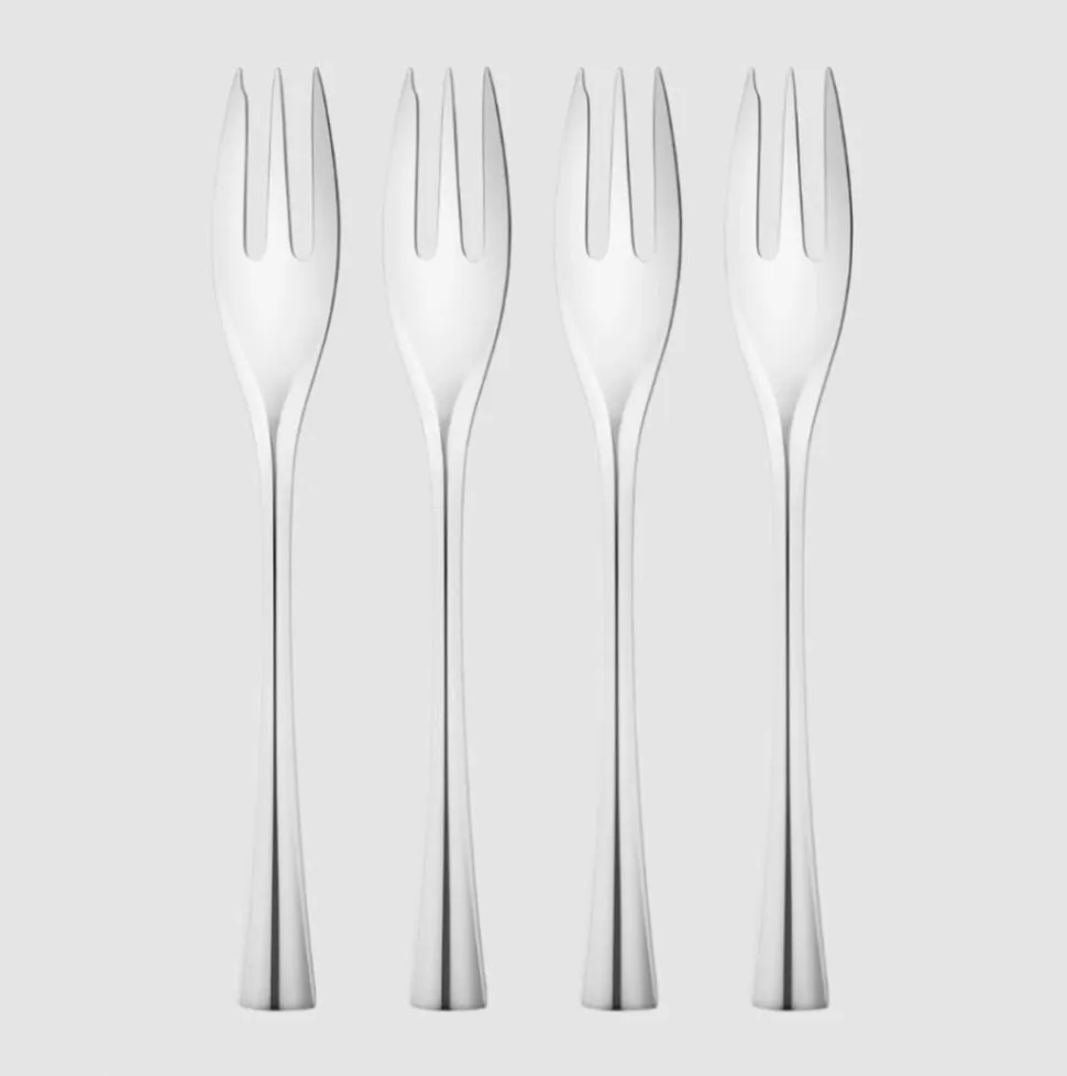 Dette sæt består af fire Cobra kagegafler fra Georg Jensen. Kagegaflerne er fremstillet i blankt rustfrit stål og egner sig til opvaskemaskine.