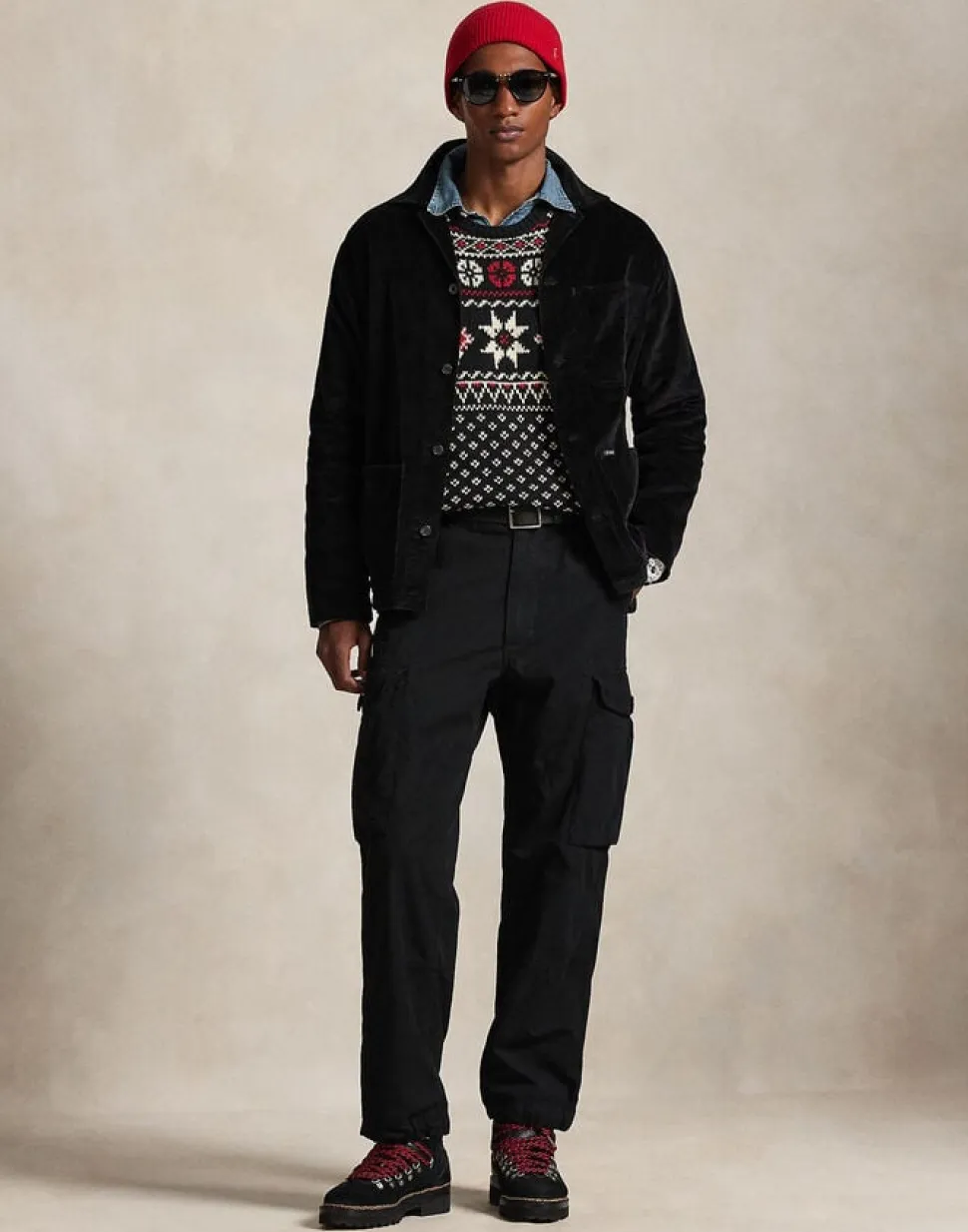 Fløjl med brede vinkler forbedrer den rå natur af dette lags arbejdstøjsinspirerede silhuet