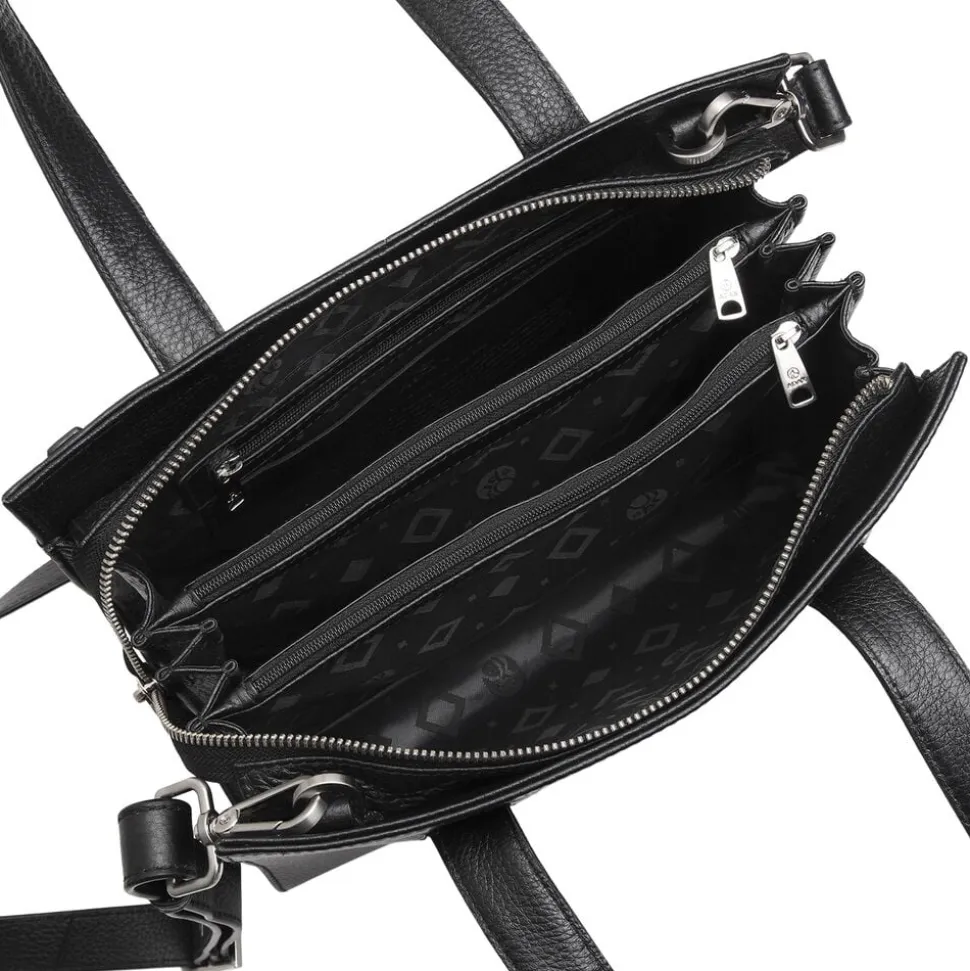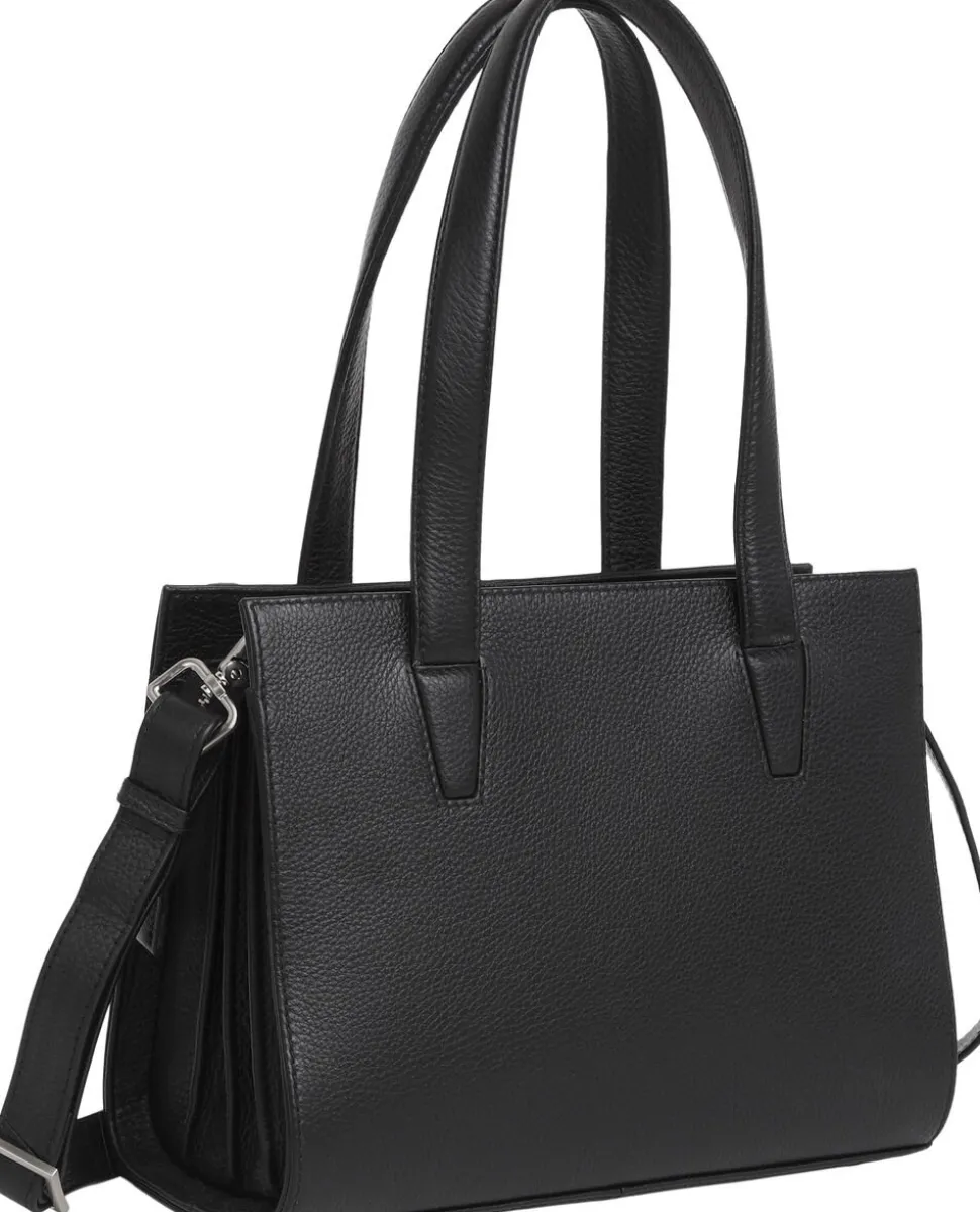 Elea håndtaske i Cormorano kalveskind. Tasken har to gode hanke samt en aftagelig skulderrem. Tasken lukkes i toppen af en lynlås. Inden i er tasken delt op i tre åbne rum og to store rum med lynlås. Ydermere er der en læderlomme til en mobil og lynlåslomme på inderside samt på lomme ydersiden. 28x21x14 cm