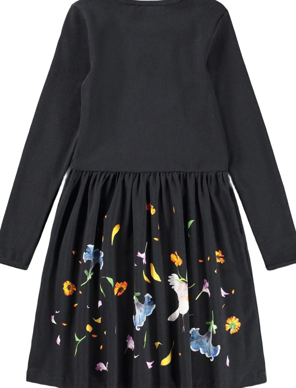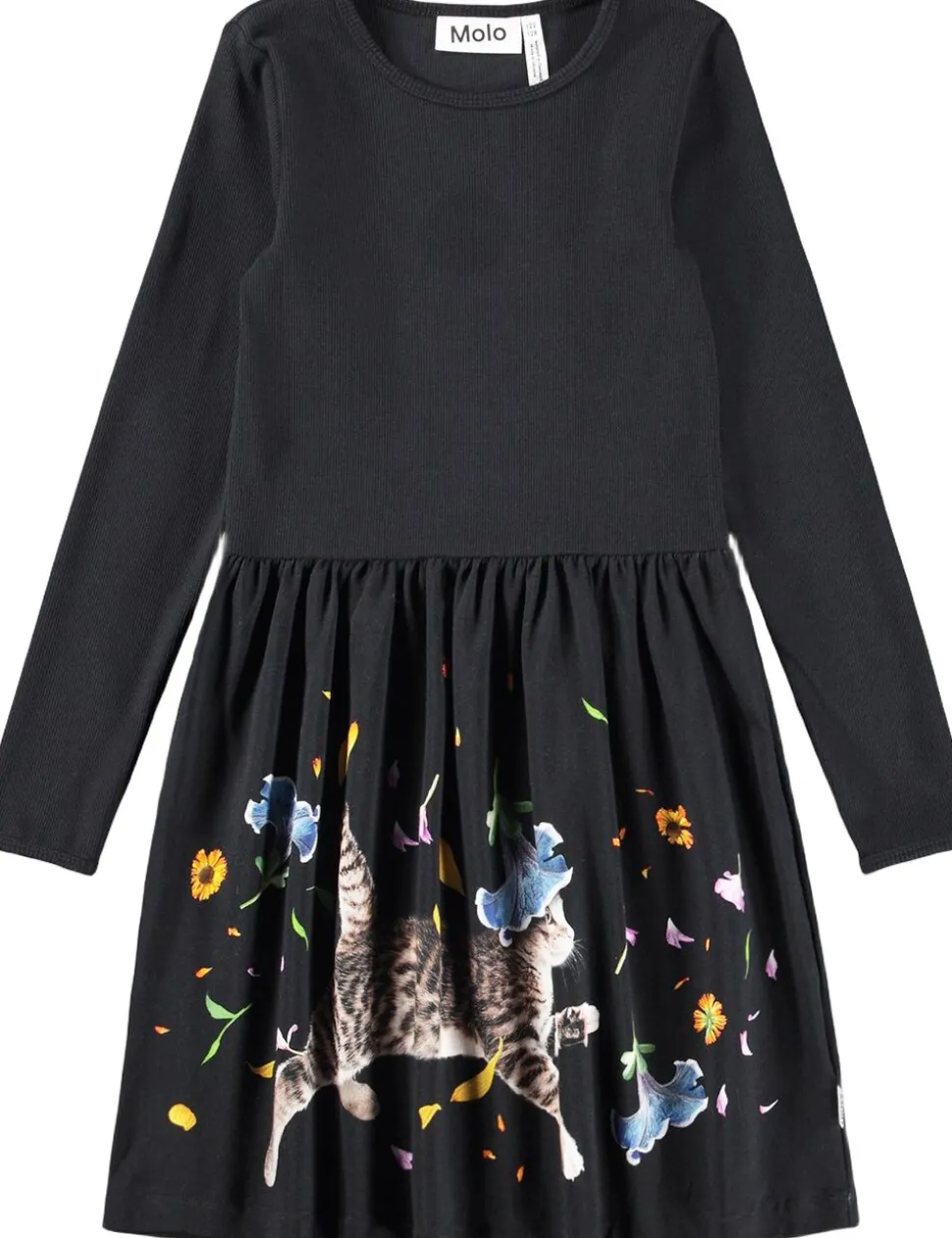Langærmet kjole i blød bomuldsjersey. Overdelen har en tætsiddende pasform i ribbet stof, mens skørtet er lavet af strækbart jersey. Det farverige print af en kat i blomsterregn giver et legende udtryk. Kjolen er designet til at give børn god bevægelsesfrihed, hvilket gør den ideel til leg og afslapning. Komfort og stil går hånd i hånd i denne kjole.