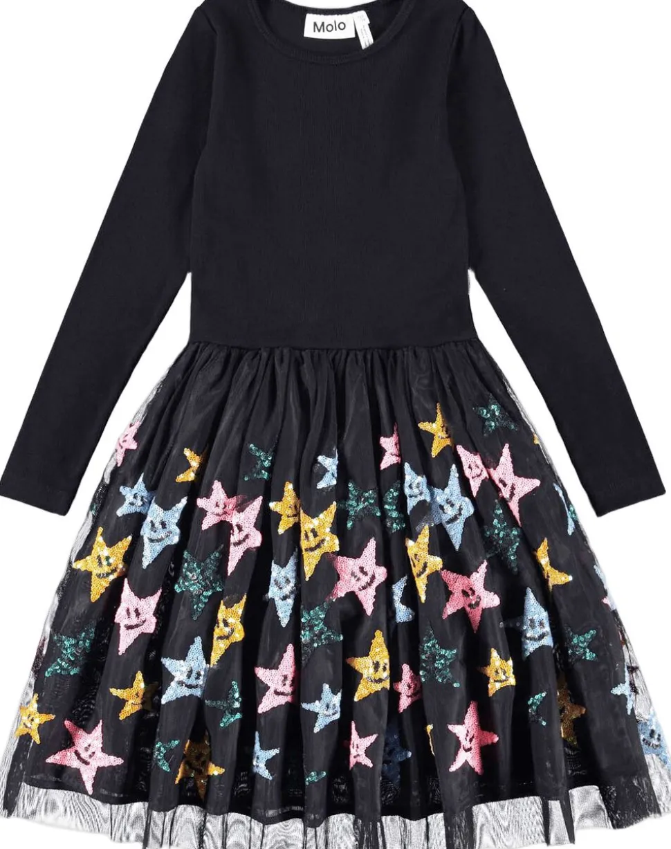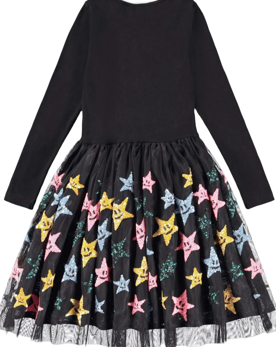 Denne sorte langærmet kjole fra Molo har et matchende tylskørt dekoreret med paillet-stjerner. Toppen er tætsiddende i ribbet bomuldsjersey med rund hals, skørtet går til knæet og har et sort underskørt.