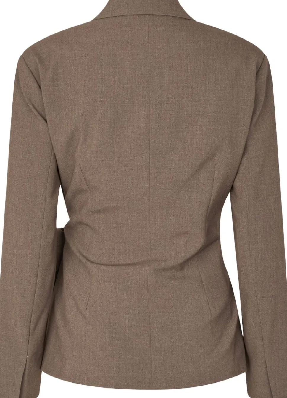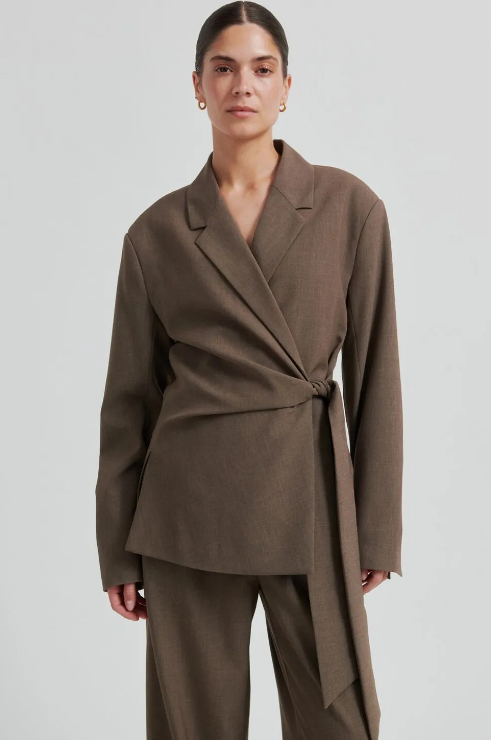 Second Female blazer med bindebånd. Blazeren er fremstillet i let materiale i let melangekvalitet. Med bindebånd i den ene side. Vatterede skuldre og slidser ved manchetterne. Knaplommer og dekorativ