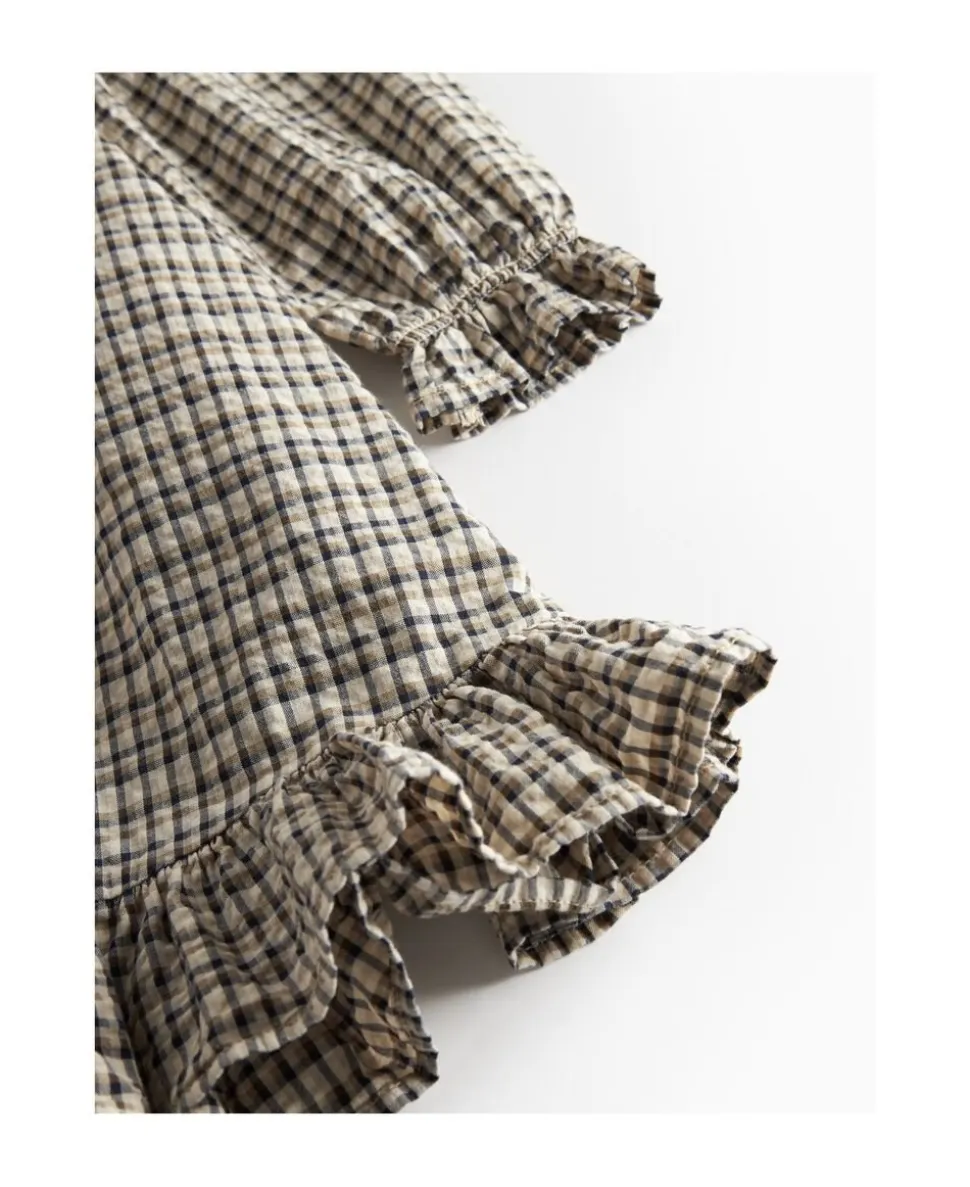 Behagelig langærmet kjole i crepet bomuld med god pasform, krave der går hele vejen rundt med fine bølgede kanter og bølgebånd forneden samt på ærmer. Kjolen lukkes med knapper foran og længden går til over knæene.
