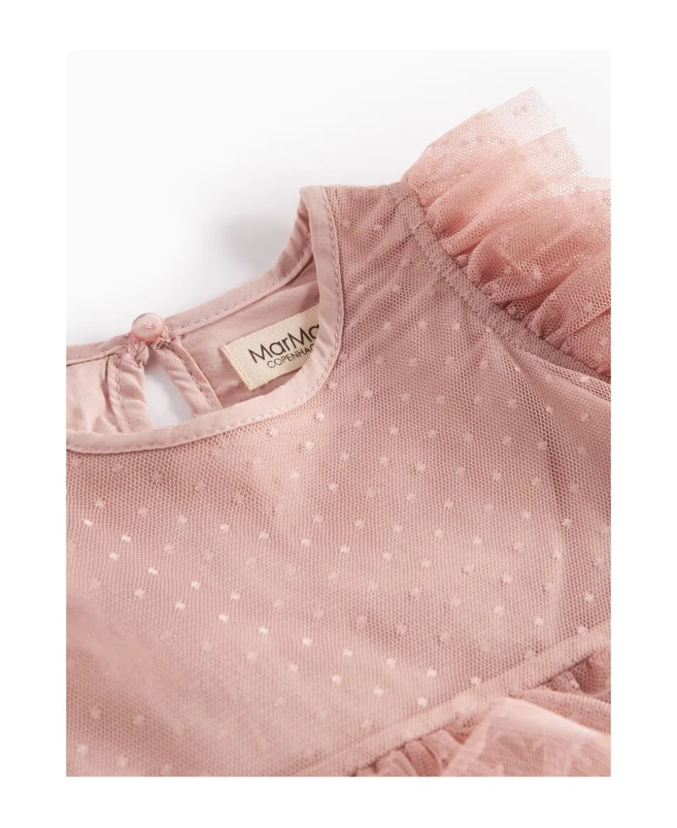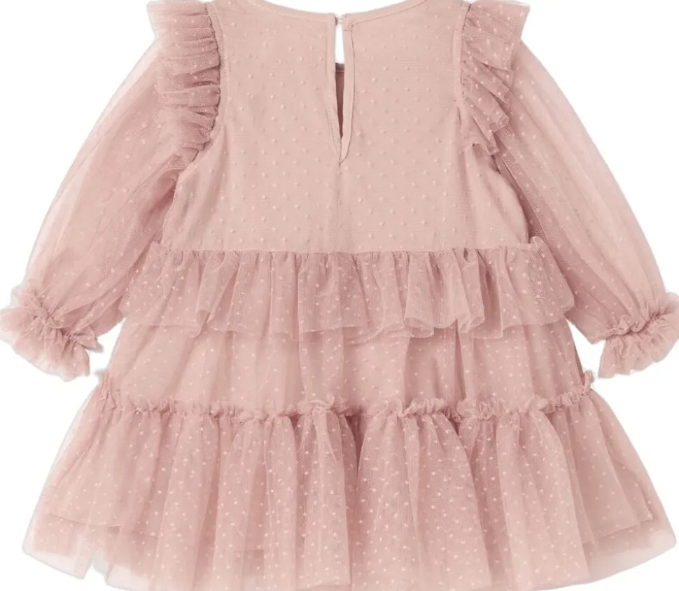 Langærmet kjole til de mindste med masser af volumen og flotte tylflæser. Kjolen er pyntet med prikker og har knaplukning bagpå. Kjolens længde går til over knæet.