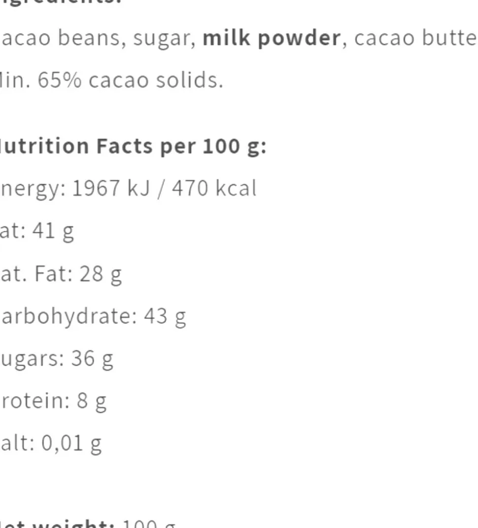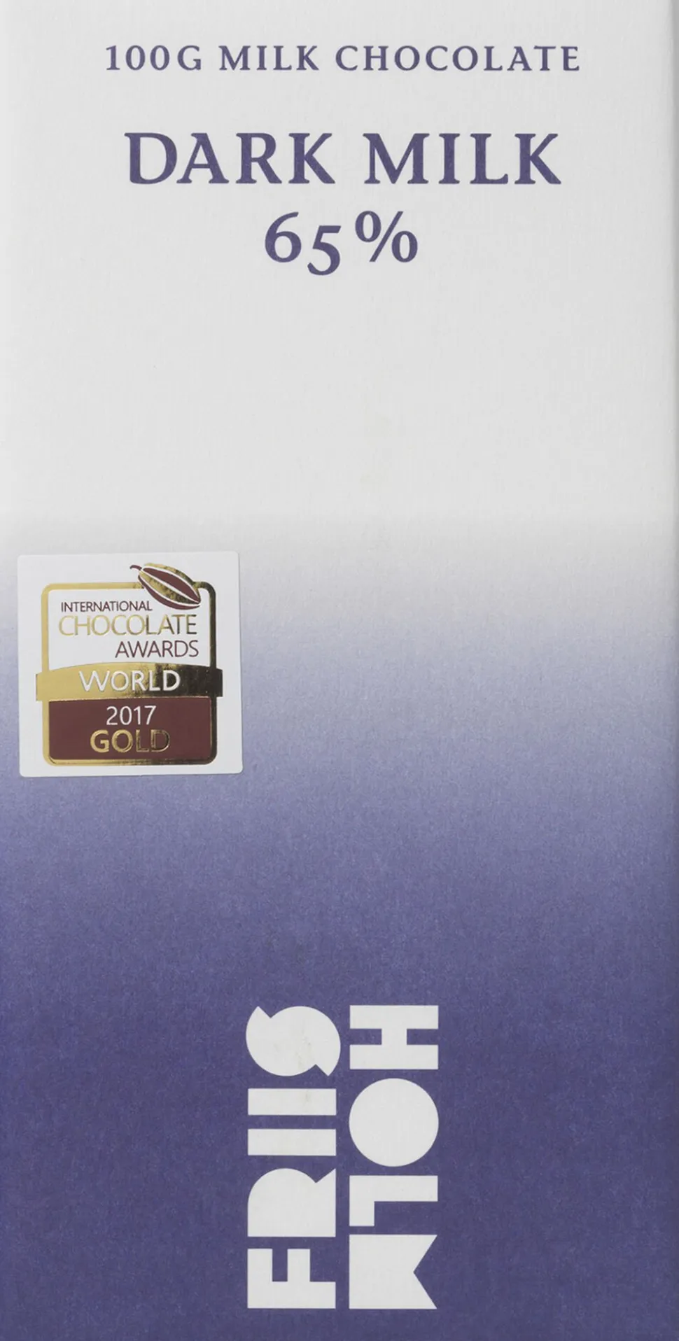 Milk 55 %, men med meget lidt mælkepulver, med andre ord er det en mørk chokolade, der er afrundet med en smule mælk. Den ligger lige mellem en mælke- og en mørk chokolade, og for nogle mennesker er det den chokolade, de har ledt efter hele deres liv.