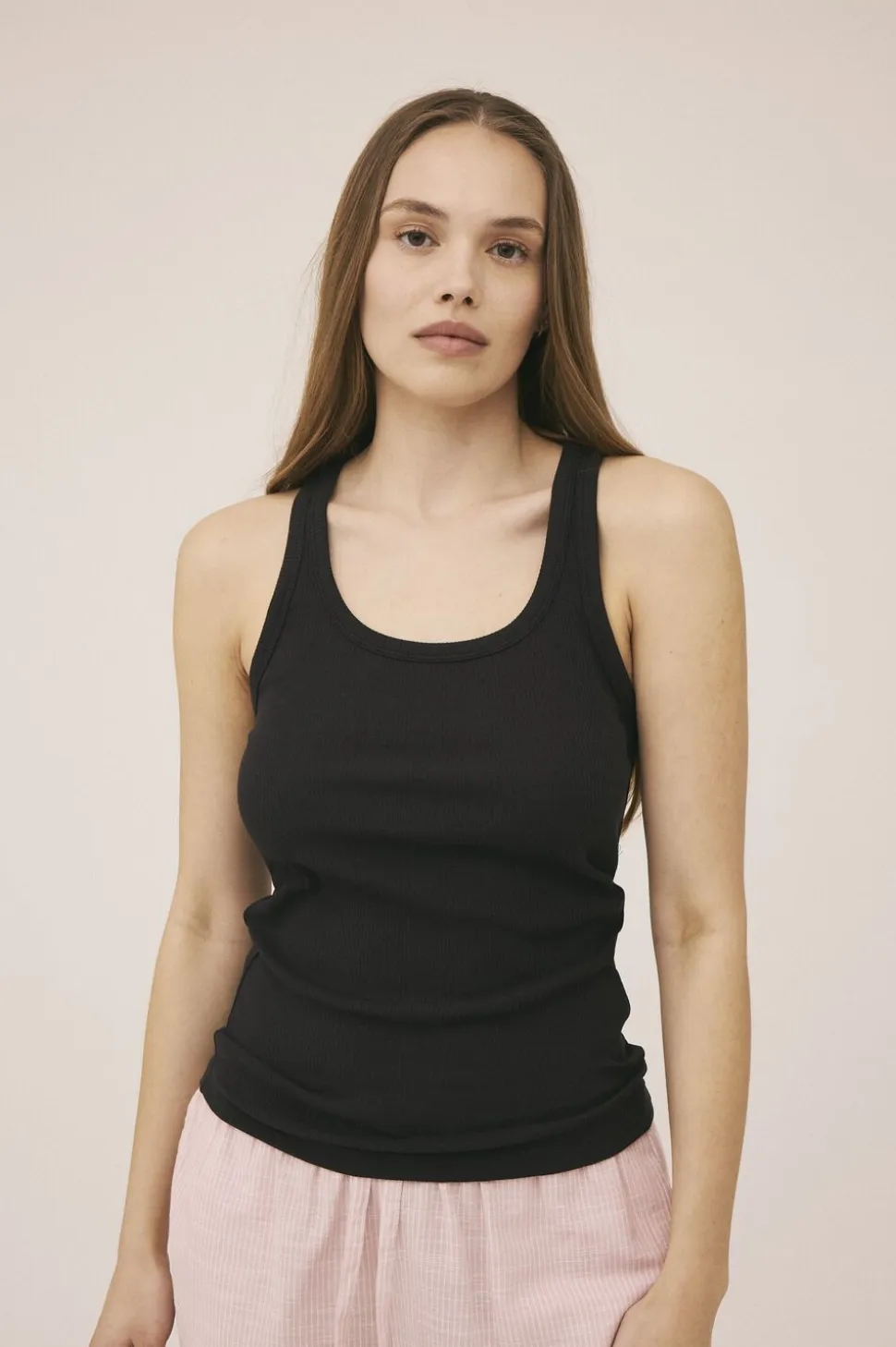 Tanktop fra Magasin du Nord Collection i den blødeste kvalitet af 93% økologisk bomuld med GOTS-certificering. Toppen har en ribstrikket struktur, der giver en skøn, tætsiddende pasform, en rund halsudskæring samt brede skulderstropper med bryderryg. En casual tanktop, der er et musthave i basisgarderoben.