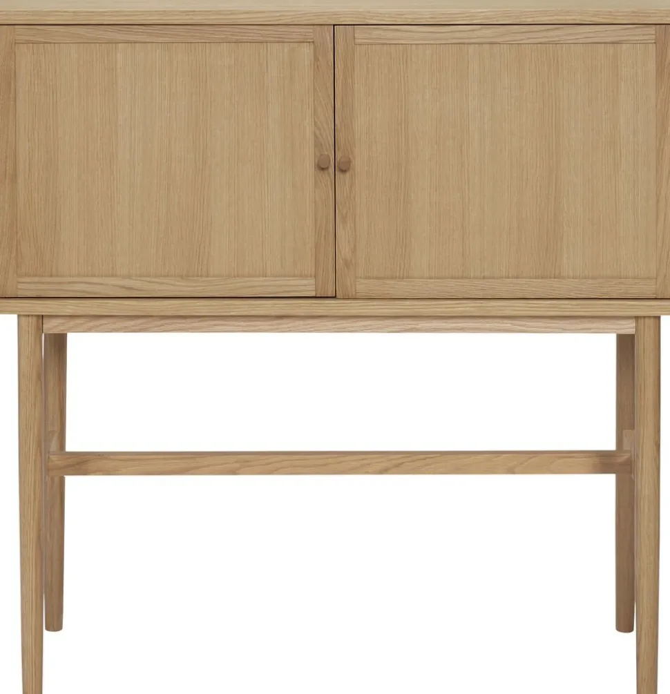Fritstående konsolbord med to låger skabt af egetræ og egetræsfiner.