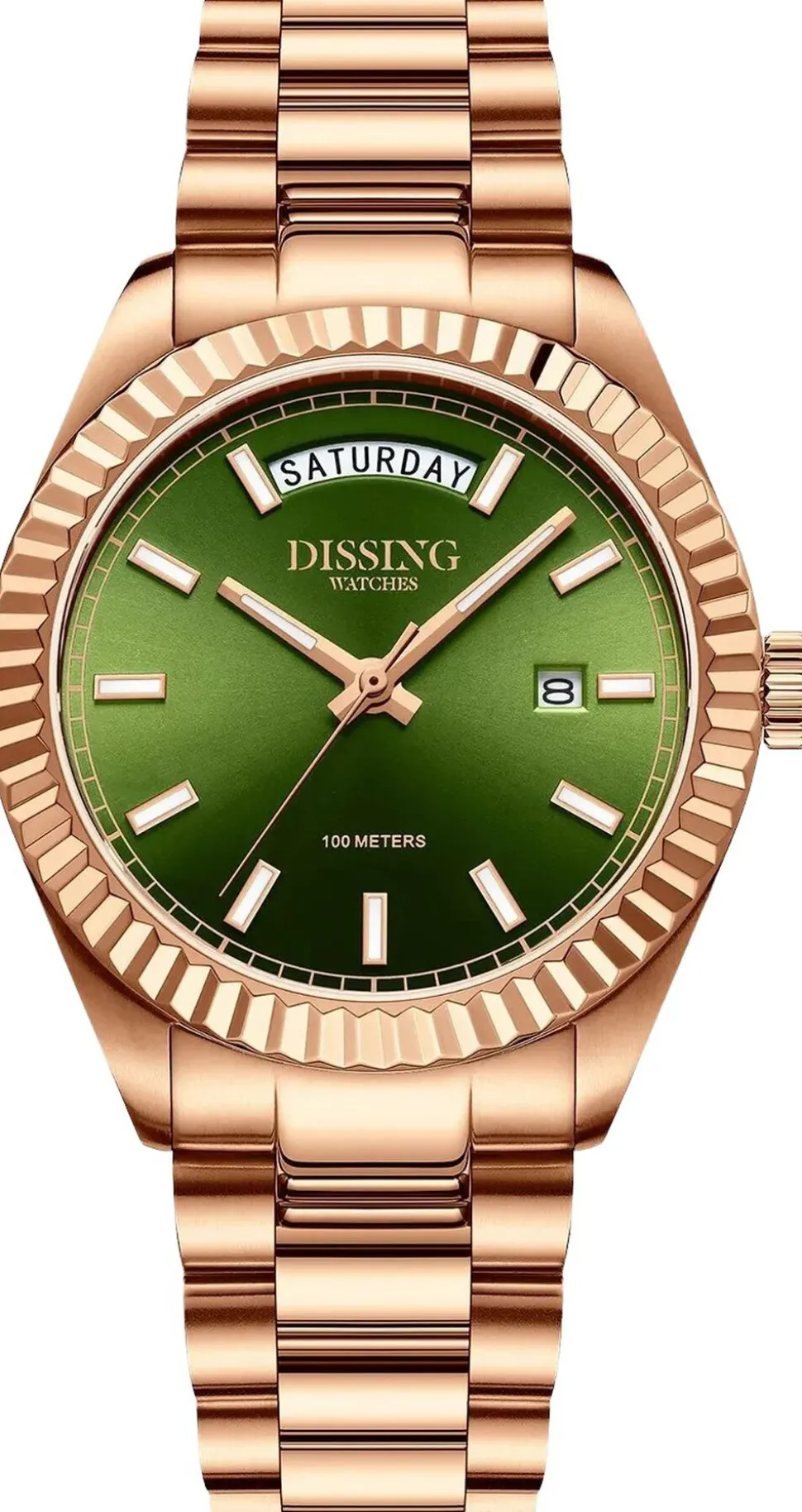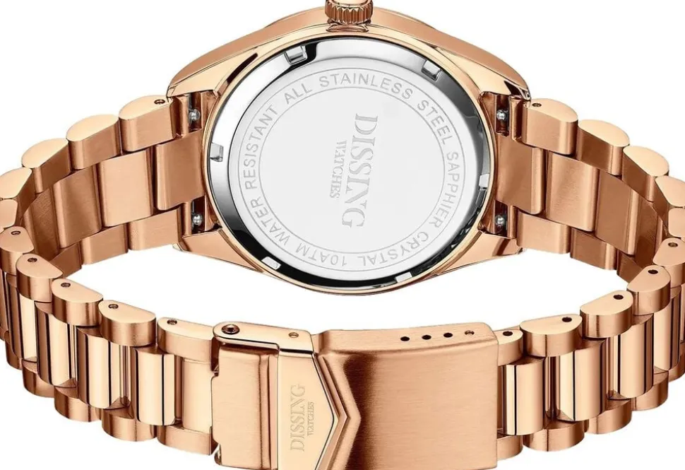 Dissing Day Date D1745 er en del af Dissing Date-kollektionen og har en rund urkasse med en flutet bezel, der tilføjer et strejf af elegance. Dens 39 mm diameter gør et subtilt, men markant indtryk på håndleddet. Den grønne urskive giver en klar baggrund for timemarkeringerne og viserne. Dette ur inkluderer en dags- og datovisning, hver placeret i separate vinduer på urskiven. Lænken i rustfrit stål, i rosaguld, komplementerer rosaguldtonerne i urkassen og bezelen, hvilket skaber et sammenhængende look. En glidelås sikrer uret og kombinerer stil med funktionalitet.