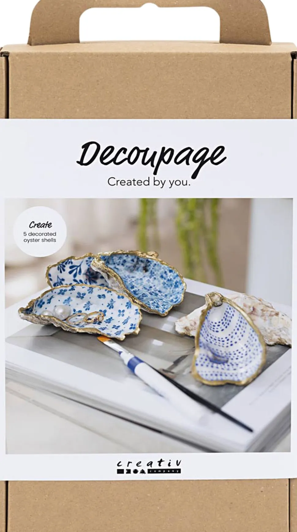 Med Creativity in a Box kan du forvandle havets skatte til små, unikke decoupage-skåle perfekte til smykker og andre småting. Indeholder materialer til fem østersskåle, og al den vejledning du behøver. Nu kan du få sommerens strandglæde ind i din boligindretning. Vores Creativity in a Box gør det nemt at lave de mest uimodståelige skåle af østersskaller og decoupage papir. Dekorer først skallerne med decoupage papir mal kanterne med guldtusch og nyd den smukke forvandling. Hver østersskal er unik. Den har stadig dens bløde, organiske form, men er nu udsmykket med fine mønstre i blålige farver.