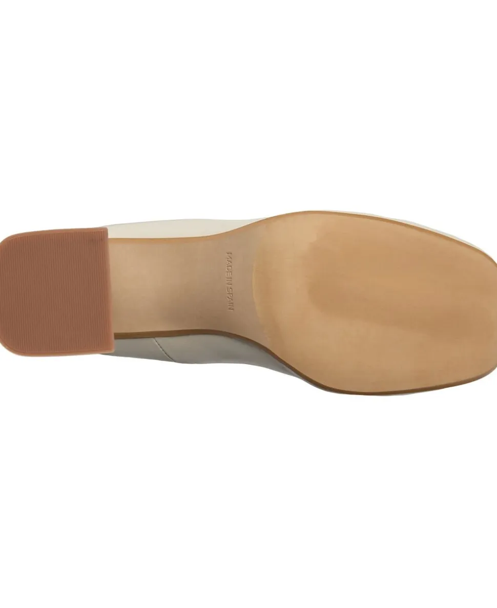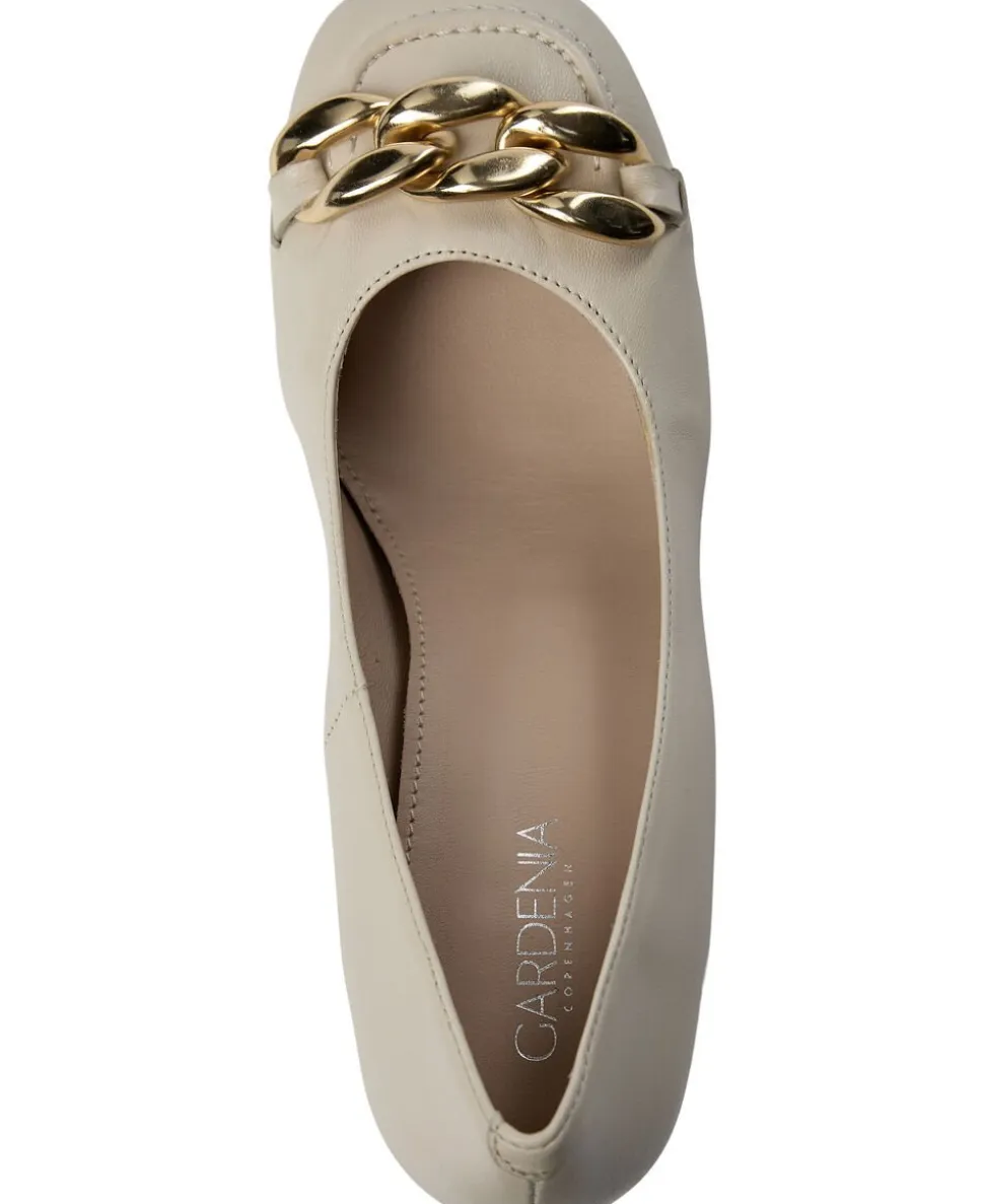 Skoen er fremstillet i læder med en firkantet tå, er dekoreret med et guldspænde over forfoden og er lavet på en skulpturel blokhæl, der giver skoen et moderne look. Materiale: Læderfarve: Cream: 7 cm størrelsesguide: Normal