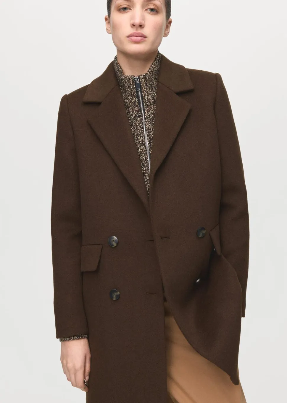 Uldblandingsstof, Available Plus, Straight Design, Midi-Design, Lapel-krave med V-udskæring, Lapel med indhak, Lange ærmer med knapper i manchetterne, To sidelommer med klap, Dobbelt knaplukning, Indvendigt for.
