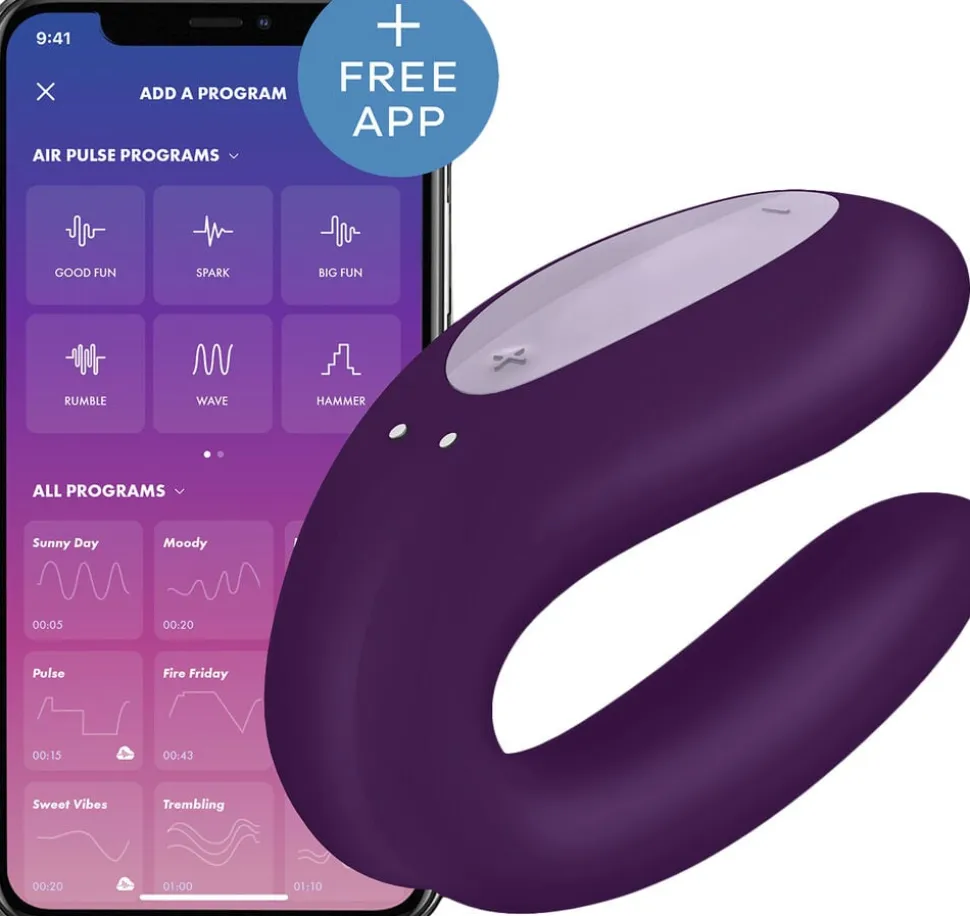 De to lydsvage motorer kan styres uafhængigt af hinanden og giver jer fuld kontrol over oplevelsen. I kan vælge mellem 10 indbyggede vibrationsprogrammer eller koble vibratoren til den gratis Satisfyer Connect App. Appen åbner for et uendeligt udvalg af programmer, justering af rytmer og muligheden for at lade en partner styre vibrationerne – uanset afstand.