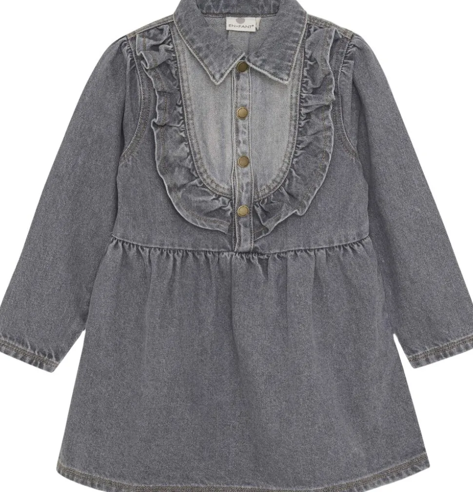 Sej denimkjole fra EN FANT med en klassisk krave og knapper fortil. Kjolen har fine flæsedetaljer og lange ærmer, der giver et stilfuldt og tidløst look. Certificeret i hht. OEKO-TEX® STANDARD 100 Cert. No. 2276-364 DTI