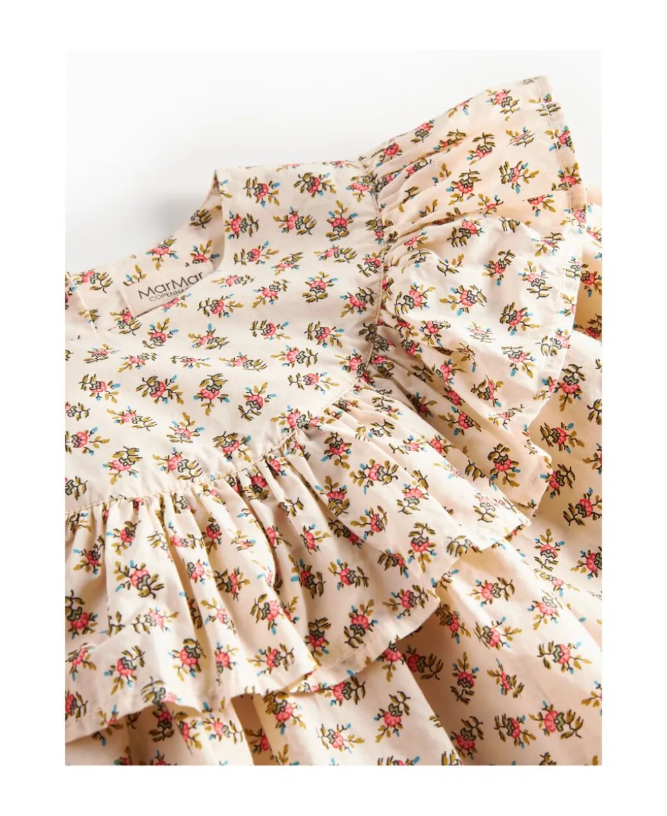 Langærmet og løstsiddende kjole til børn med håndtegnet blomster print og fine flæsedetaljer. Kjolen har knaplukning bagpå og kjolens længde går til over knæene. Kjolen er både behagelig, let og luftig at have på.