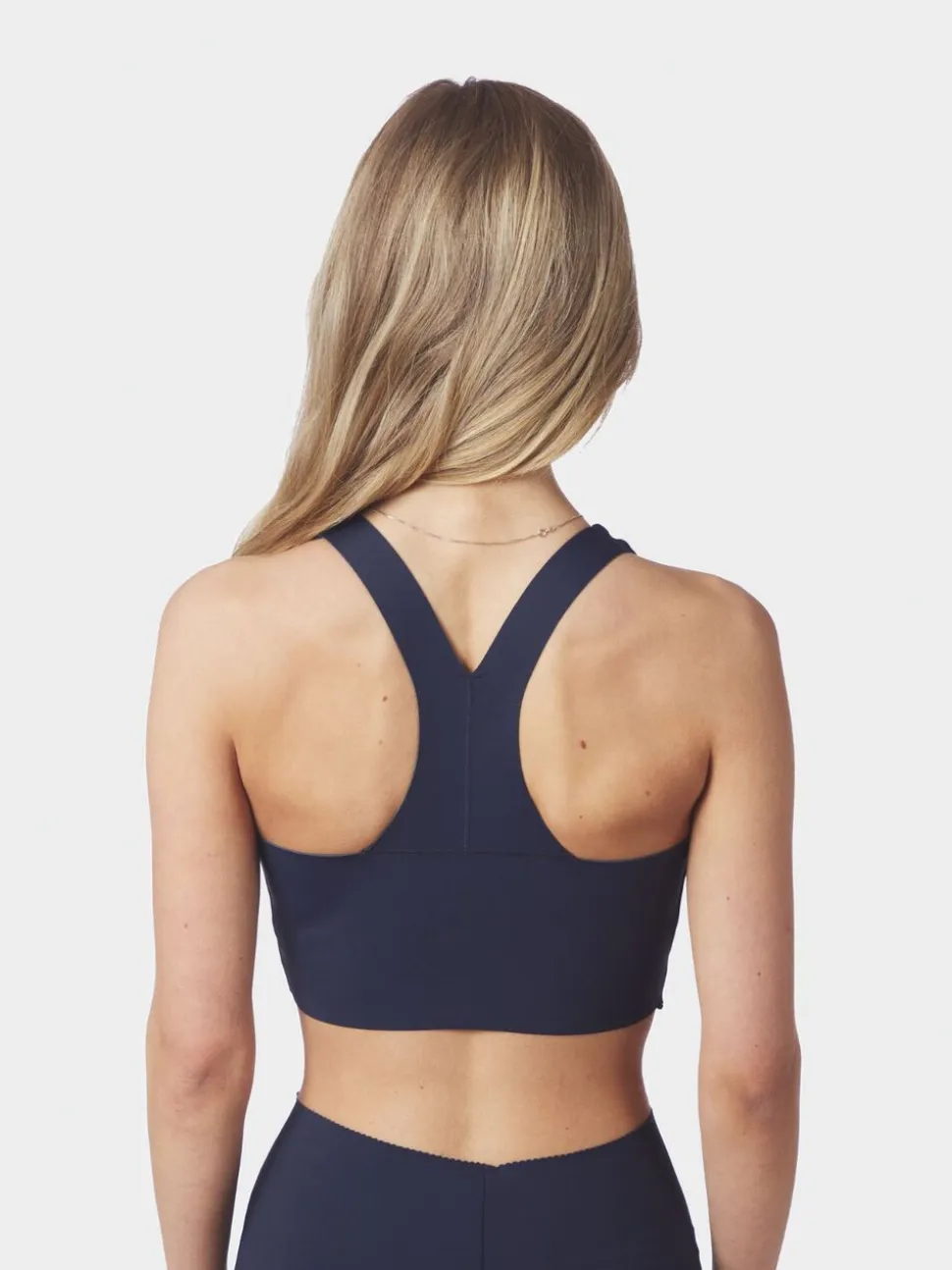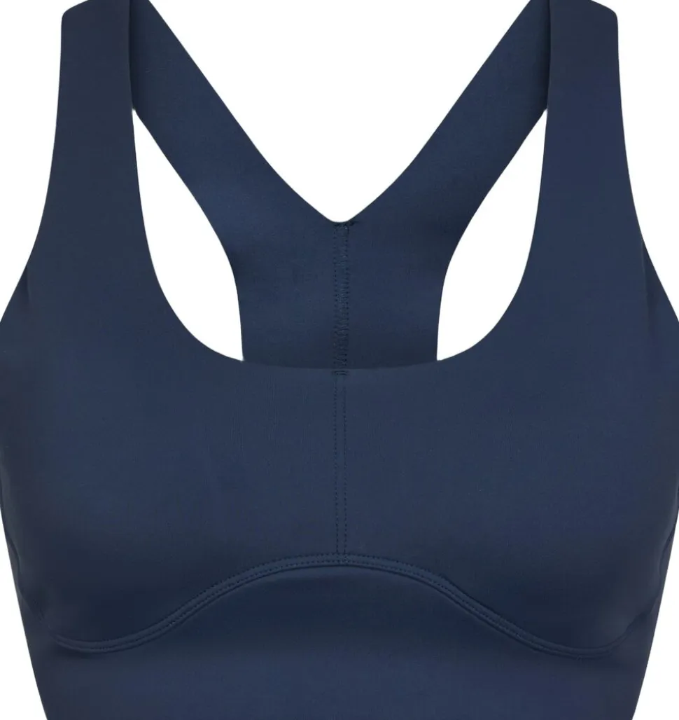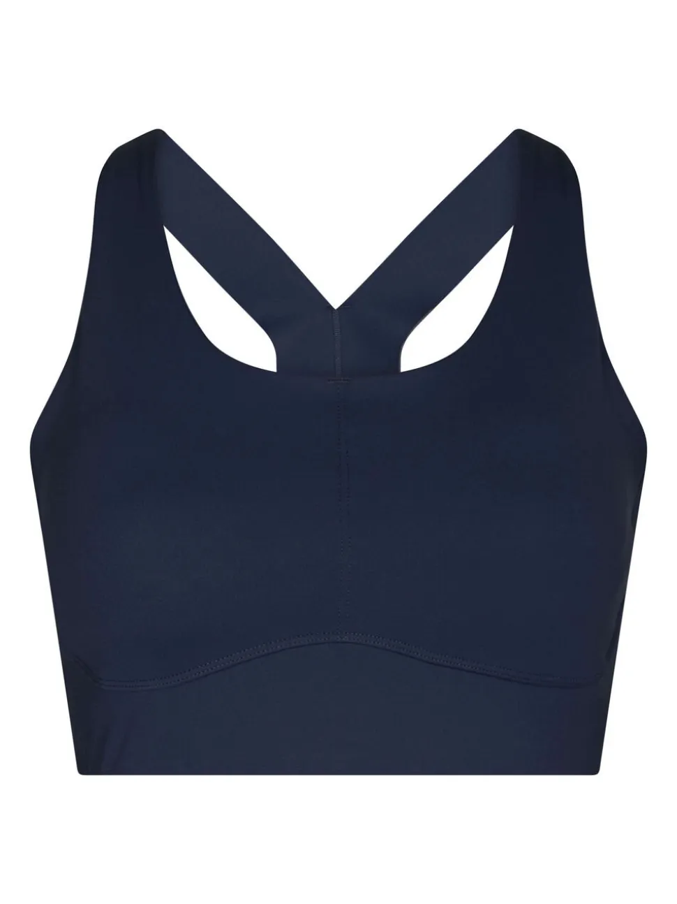 Kort sportstop. Toppen har rund halsudskæring, racerback-design og dekorative syninger. Den har brede stropper, som giver god støtte under aktivitet. Pasformen er tætsiddende, og den er fremstillet i et strækbart materiale. Modellen bærer størrelse 36.