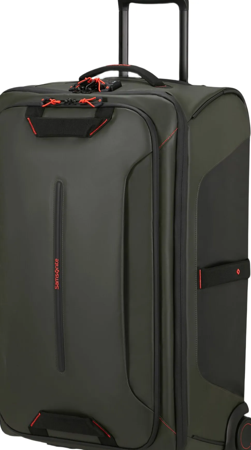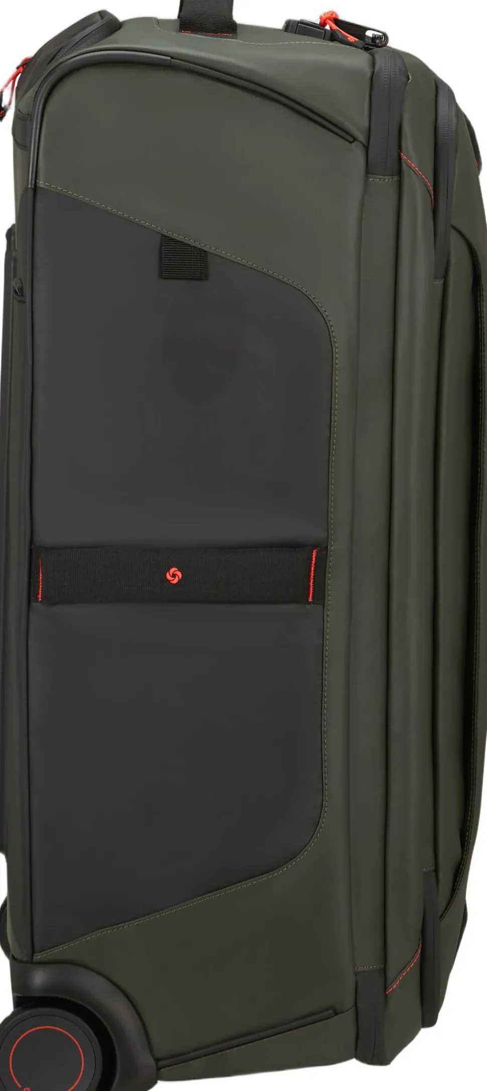 Duffle på hjul hvor både det udvendige og indvendige stof er lavet af genbrugt nylon og polyester, vandafvisende materiale, front og sidelomme, TSA lås, rumindhold 76 liter, vægt 2,9 kg. 5 års begrænset garanti.