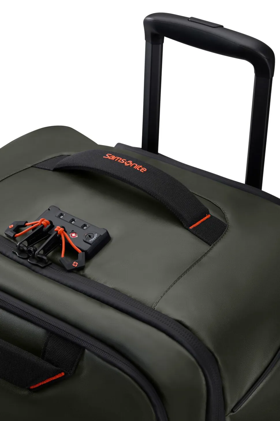 Duffle på hjul hvor både det udvendige og indvendige stof er lavet af genbrugt nylon og polyester, vandafvisende materiale, front og sidelomme, TSA lås, rumindhold 122 liter, vægt 3,4 kg. 5 års begrænset garanti.