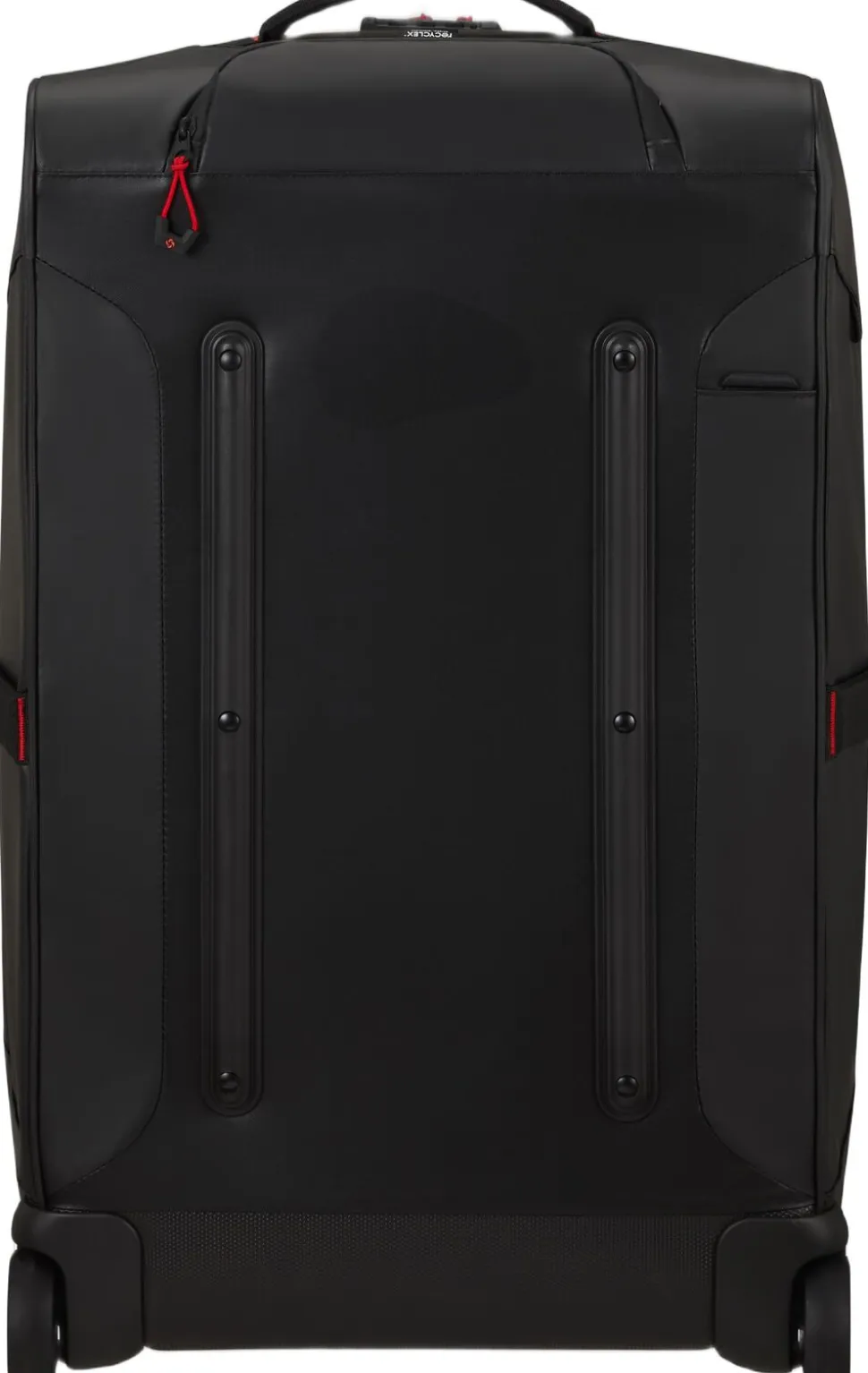 Duffle på hjul hvor både det udvendige og indvendige stof er lavet af genbrugt nylon og polyester, vandafvisende materiale, front og sidelomme, TSA lås, rumindhold 76 liter, vægt 2,9 kg. 5 års begrænset garanti.