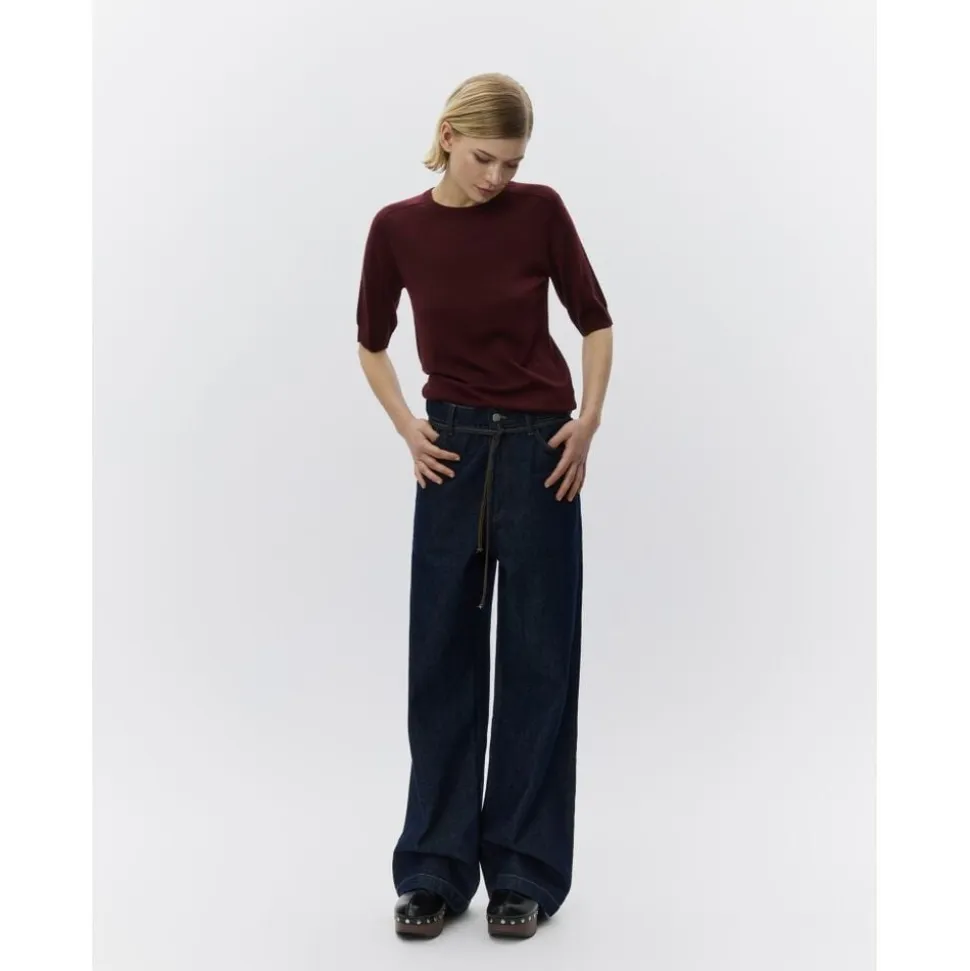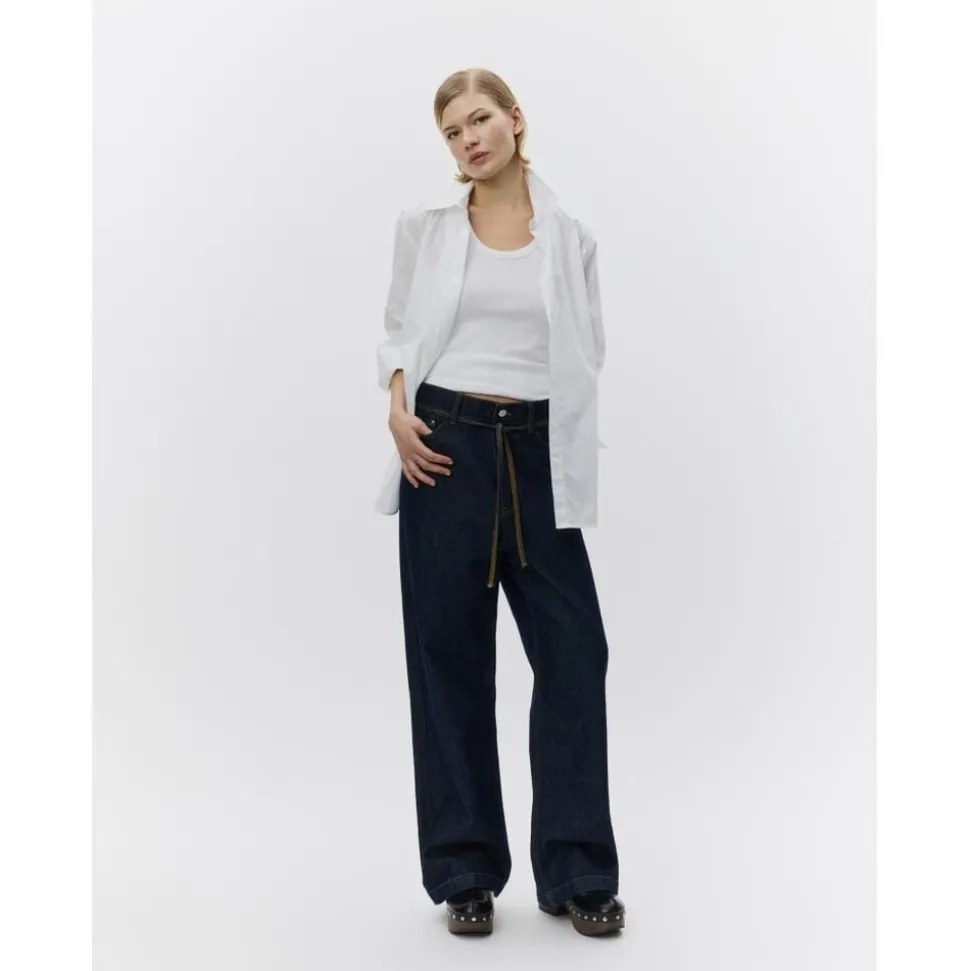 Disse jeans med lav talje og lige ben har fem lommer, lynlåslukning med knapper og et aftageligt bindebælte i taljen. Jeansene har en Løs pasform.