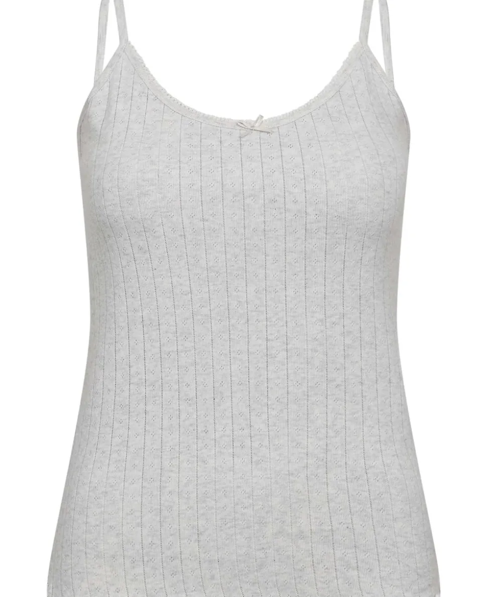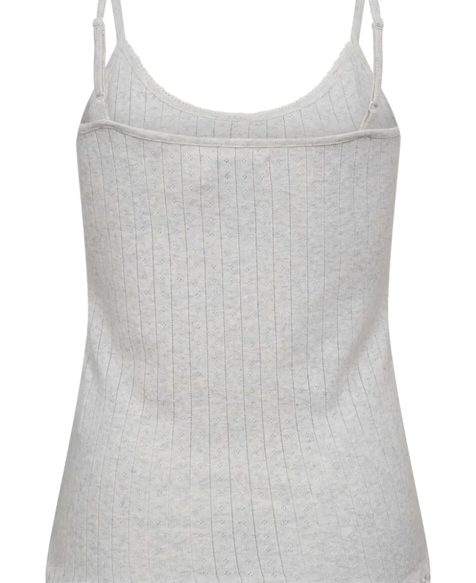 Top fra Magasin du Nord Collection i den blødeste kvalitet af 100% økologisk bomuld med GOTS-certificering. Toppen er enkel i modellen med et fint mønster, smalle skulderstropper, rib og blondekant i den runde halsudskæring samt elegante bølgekanter i bunden. En skøn top i den lækreste kvalitet.