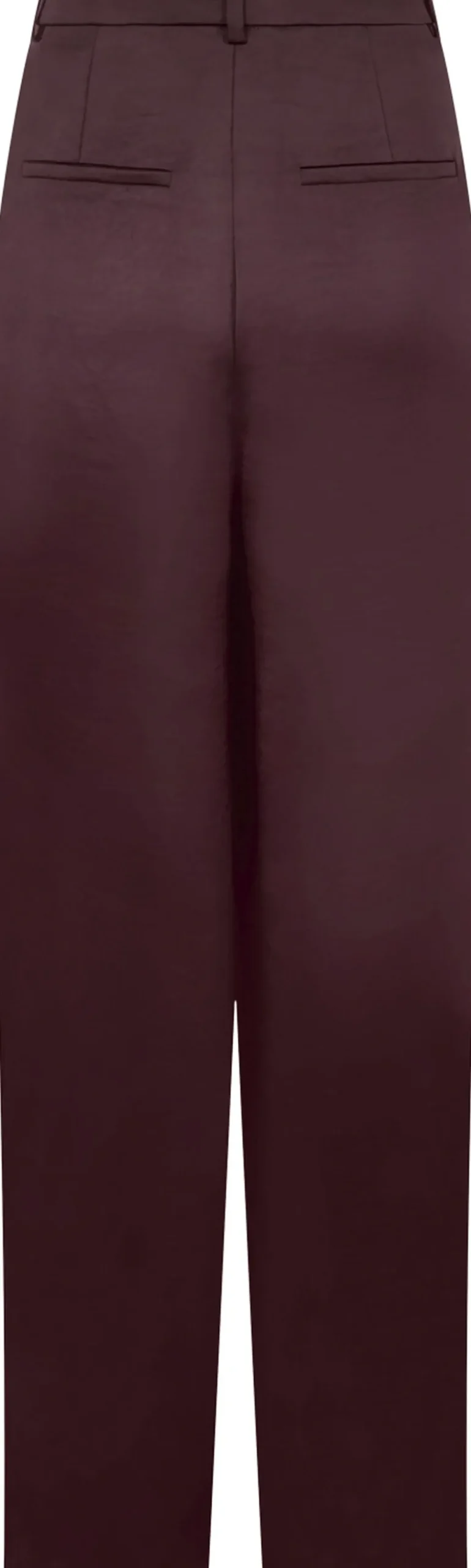 Bukser i en kraftig satin. Bukserne er højtaljede og har lige ben med vidde. De lukkes med skjult lynlås og hægte, har bæltestropper i taljen og lommer i siden. Modellen er iført størrelse 36.