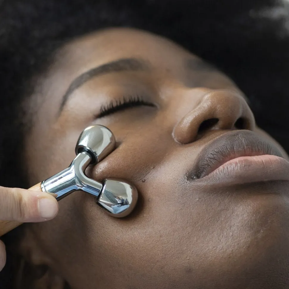 Den dobbelte massagebold er ideel til den ovale del af ansigtet, øjenbrynsbuen og kindbenene takket være dens palperende og drænende bevægelse.