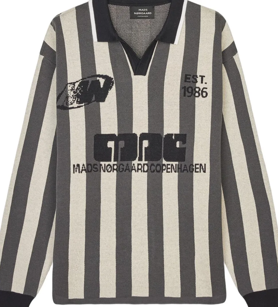 Striktrøje a la fodboldtrøje med polokrave, strikkede ribkanter og strikket logo på brystet og maven.