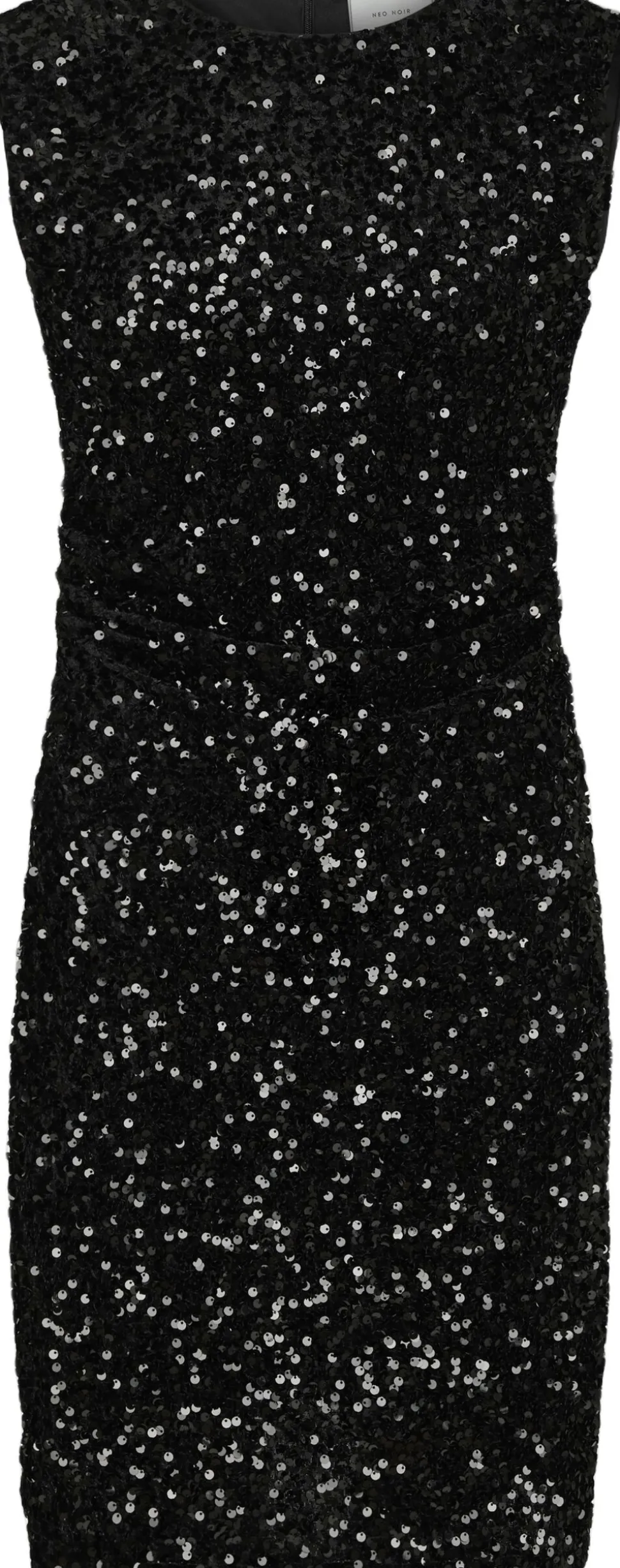 Kort kjole i velour med palietter. Kjolen har rund halsudskæring, er ærmeløs og lukkes med en skjult lynlås i ryggen. Den har en tætsiddende pasform. Modellen er iført størrelse 36.